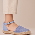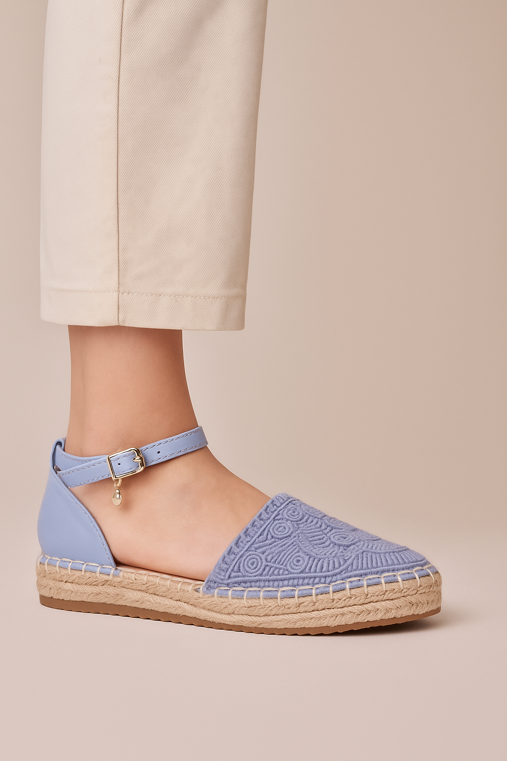 Esta alpargata en tono azul combina frescura, artesanía y comodidad en un solo diseño. El detalle tejido en la parte frontal aporta un aire artesanal y auténtico, mientras que la pulsera al tobillo con hebilla metálica y dije colgante brinda un toque delicado y femenino que realza cualquier look. Su base de yute trenzado refuerza la esencia veraniega de este calzado, manteniéndolo ligero y versátil.
