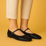 Diseño clásico tipo ballerina con correa y hebilla ajustable.