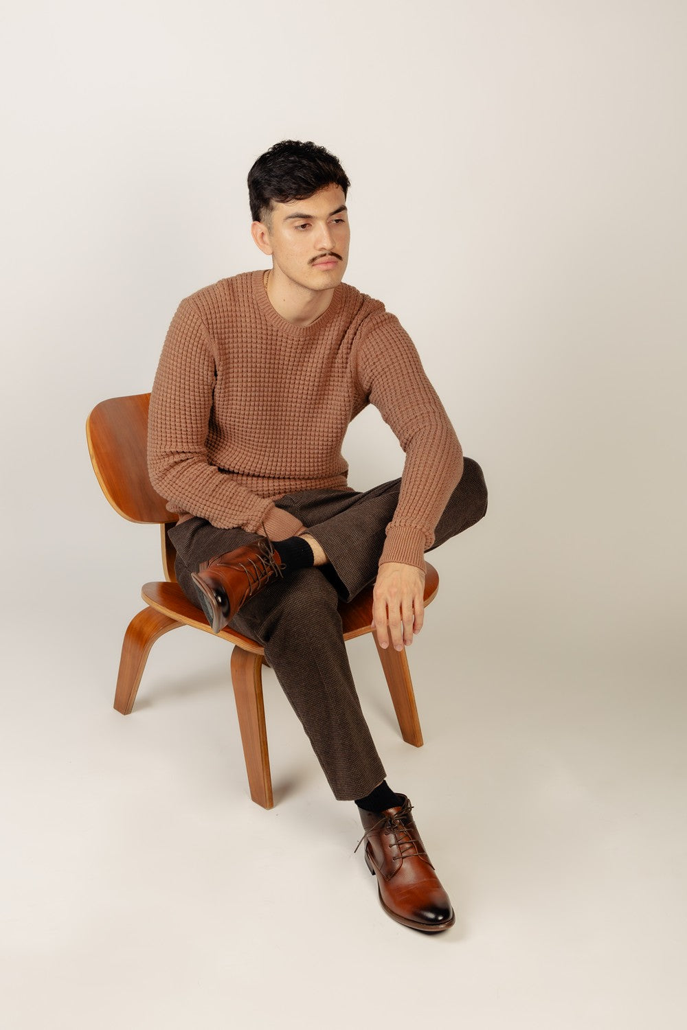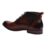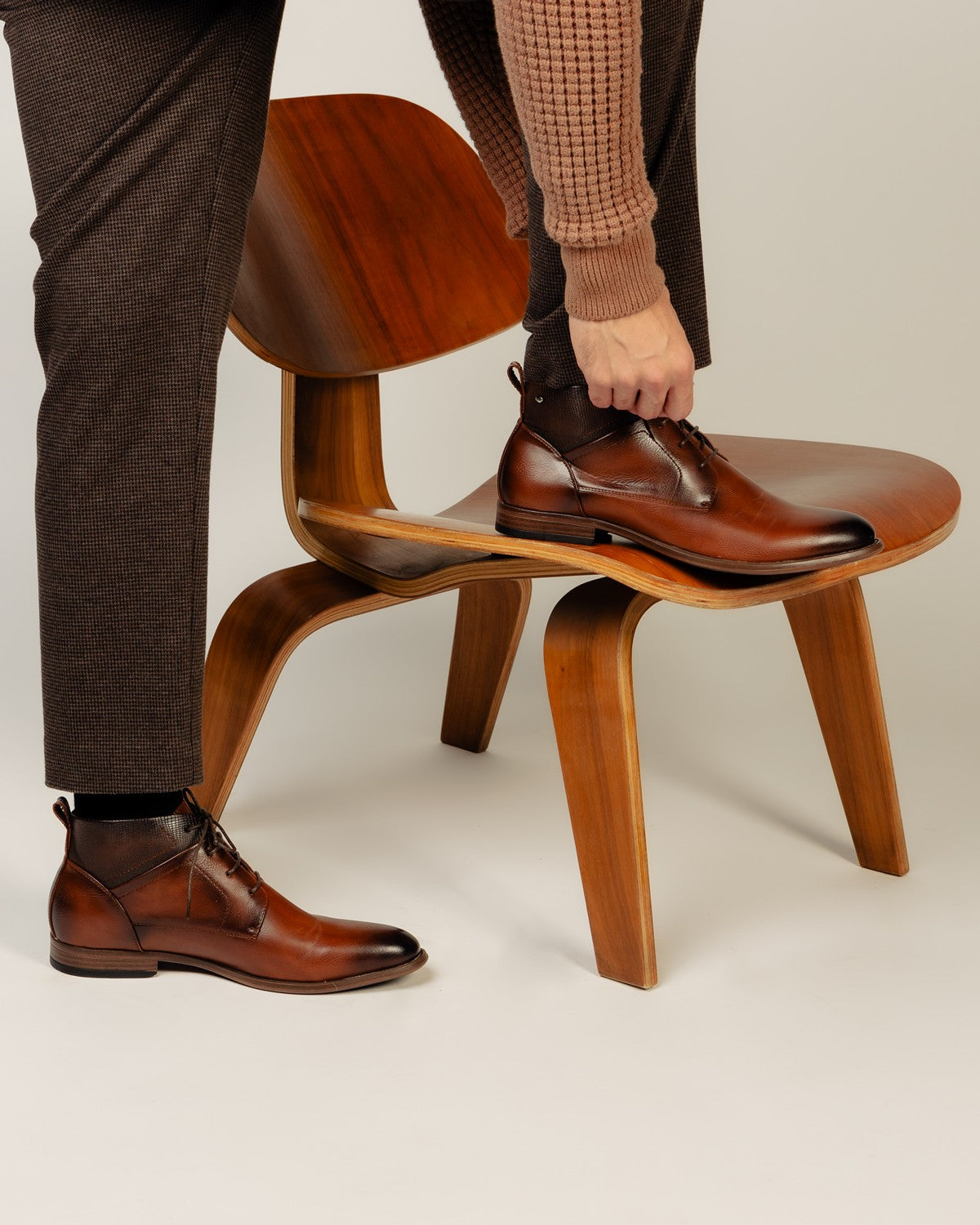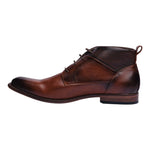Bota de vestir para caballero en un elegante tono tan con acabados oscuros que realzan su carácter sofisticado. Su diseño estilizado con agujetas frontales ofrece un ajuste firme y cómodo, mientras que el contraste de texturas en el tobillo añade un toque moderno y distintivo.