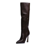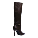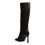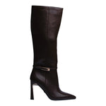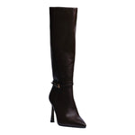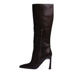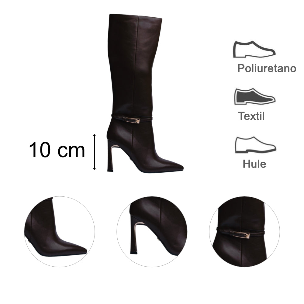Esta bota alta en color café combina elegancia y carácter en un diseño sofisticado que estiliza al máximo la silueta. Su acabado en poliuretano de alta calidad, junto con la punta fina y el tacón de 10 cm, crean un look impactante ideal para quienes buscan proyectar confianza y distinción.