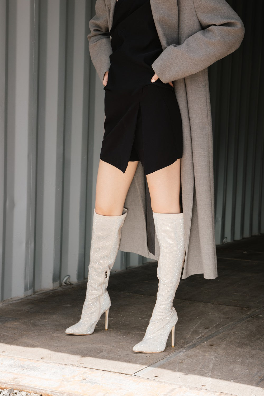 Atrévete a brillar con esta bota alta plateada con incrustaciones de cristales, un diseño impactante que combina glamour y sofisticación. Su acabado brillante y la textura recubierta de destellos convierten cada paso en un reflejo de estilo único, perfecto para quienes buscan destacar en eventos especiales o noches elegantes.