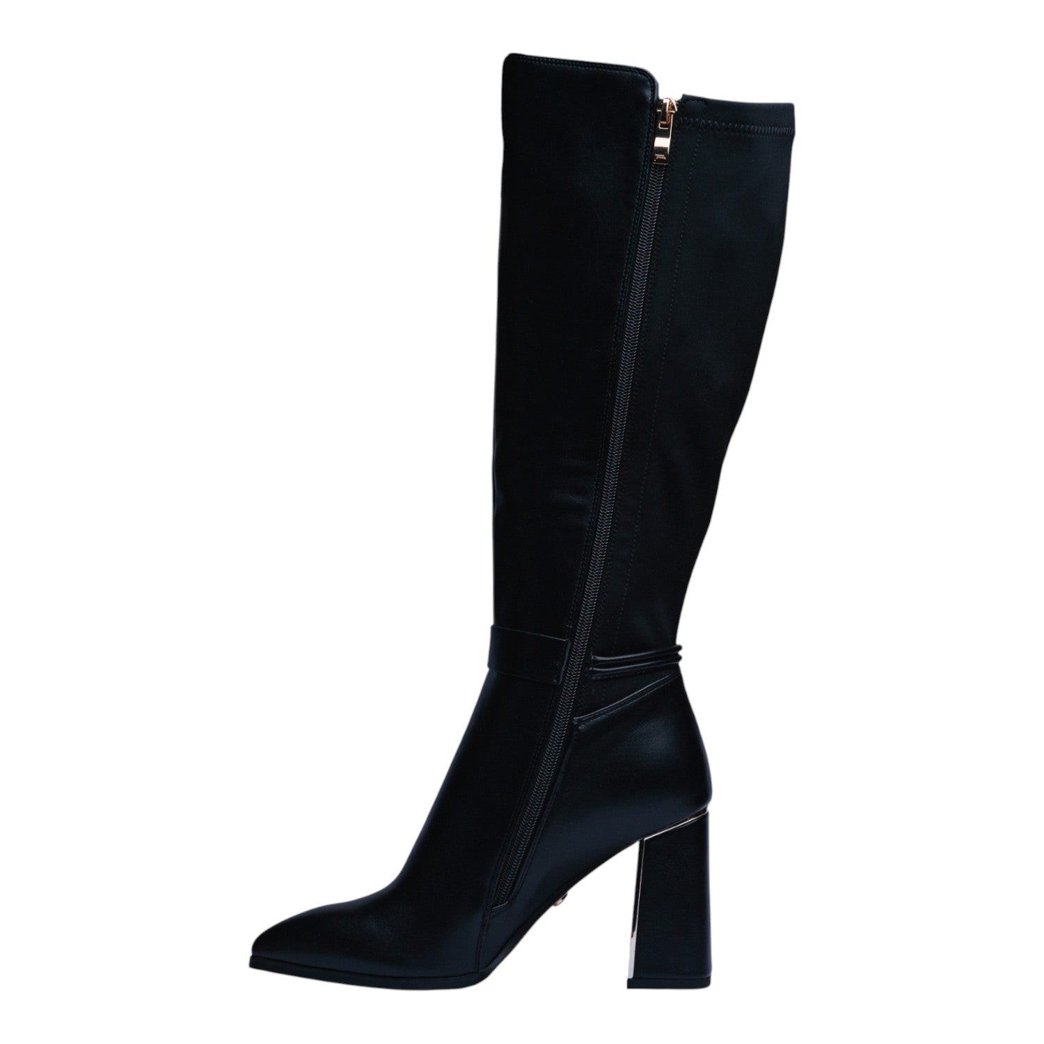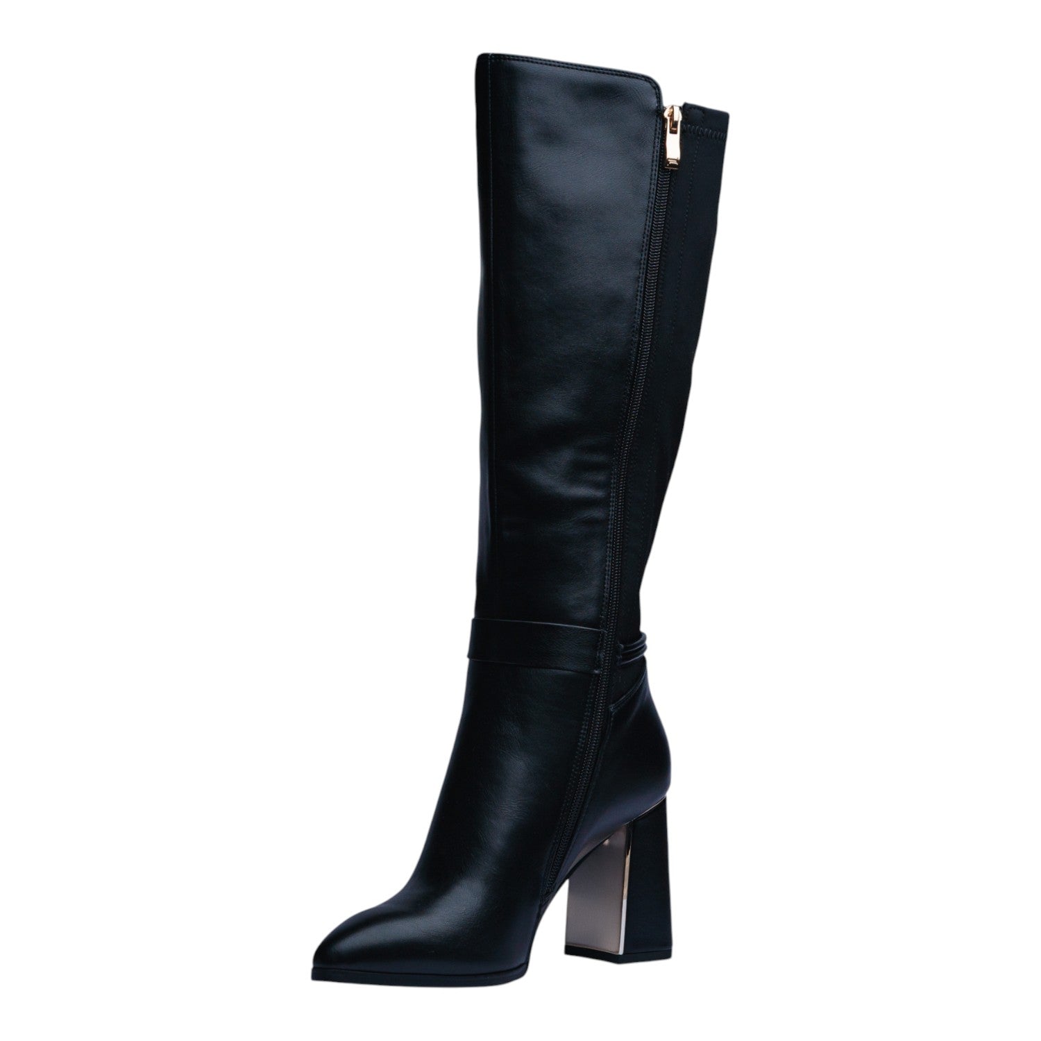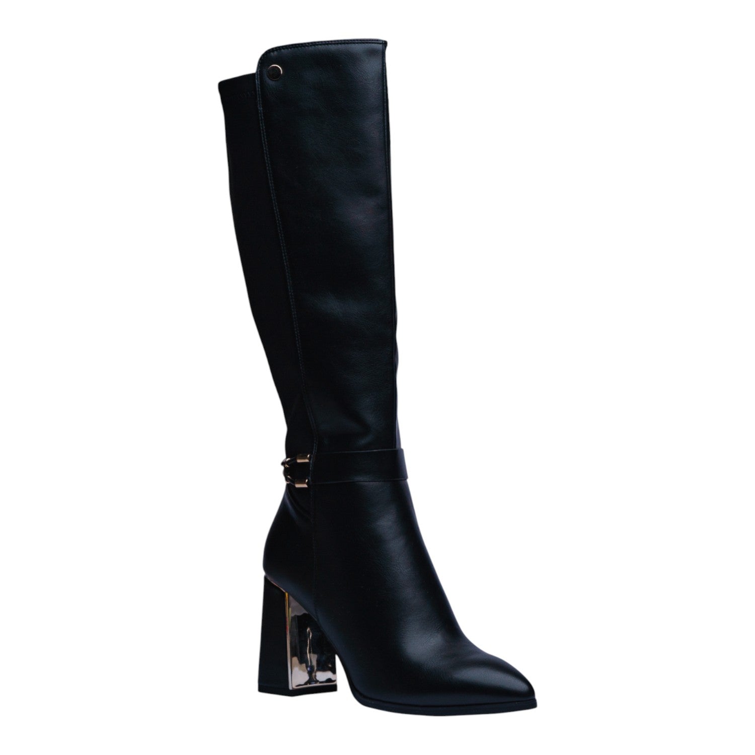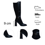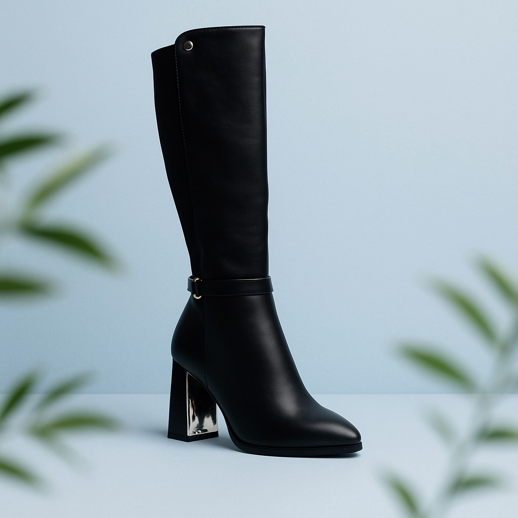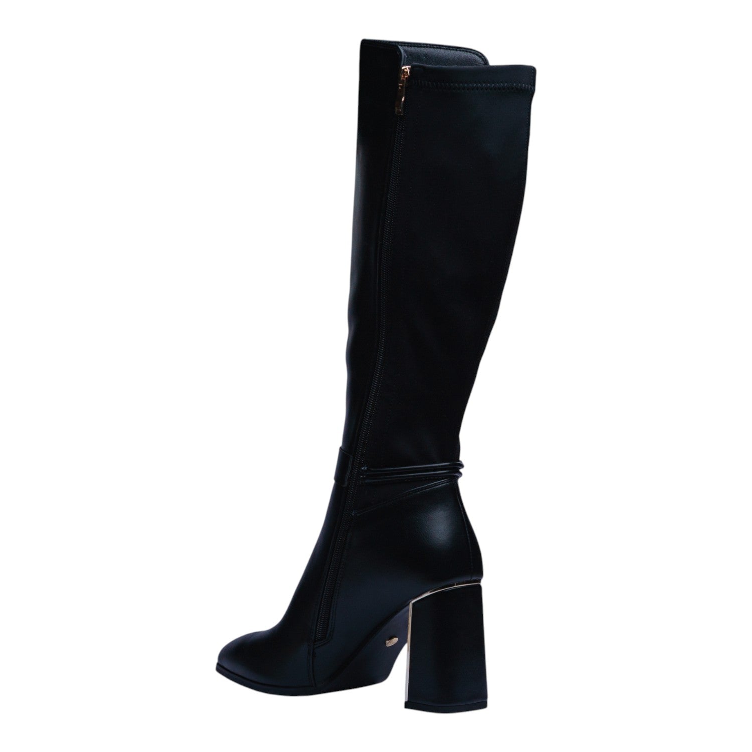 Esta bota alta en color negro es el equilibrio perfecto entre elegancia y comodidad. Su diseño minimalista y sofisticado con acabado liso la convierte en una pieza versátil que se adapta a cualquier estilo, desde un look casual chic hasta un outfit más formal.