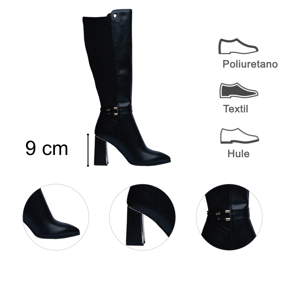 El tacón ancho de 7.5 cm ofrece estabilidad y confort en cada paso, mientras que la caña estilizada alarga la silueta de manera favorecedora. El forro textil garantiza suavidad al contacto, haciendo de esta bota una opción ideal para llevar durante todo el día.