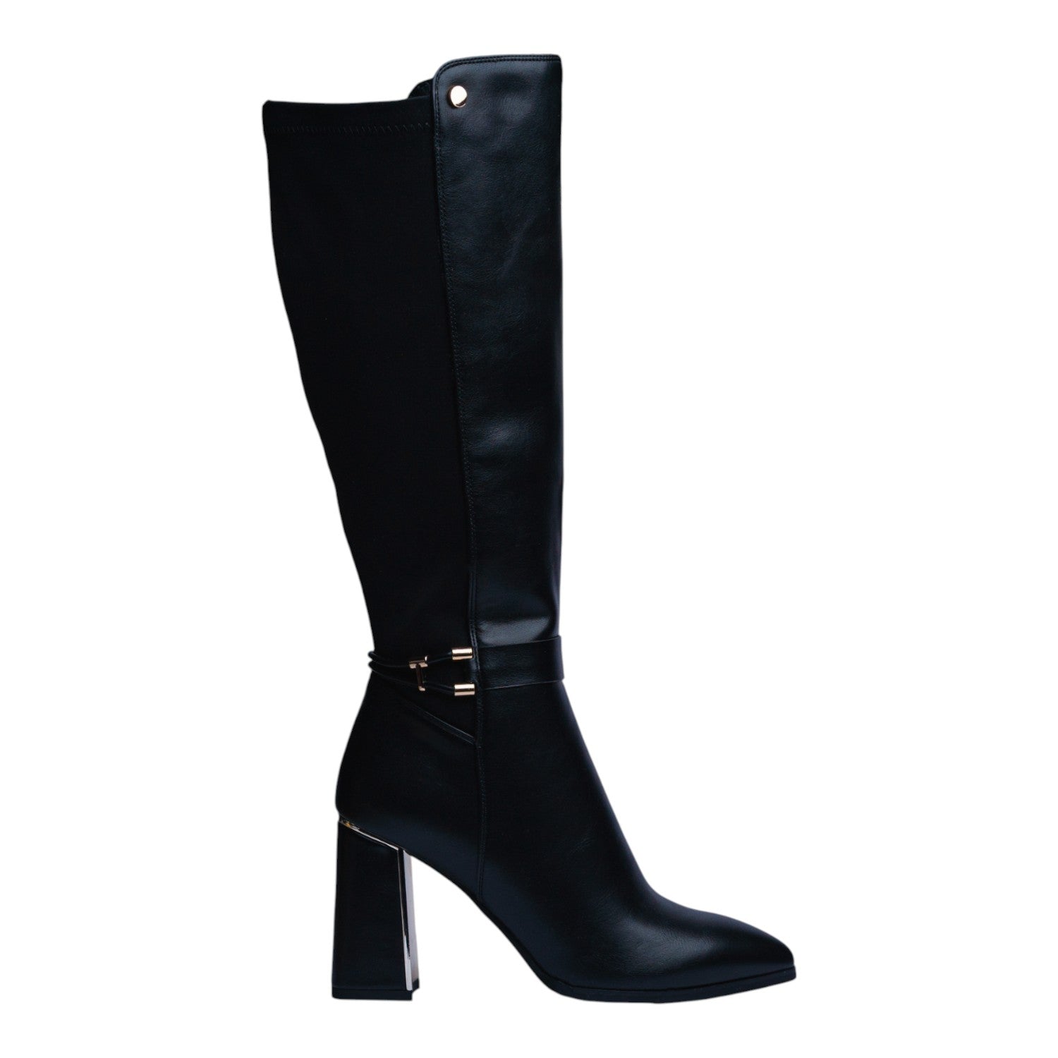 Esta bota alta en color negro es el equilibrio perfecto entre elegancia y comodidad. Su diseño minimalista y sofisticado con acabado liso la convierte en una pieza versátil que se adapta a cualquier estilo, desde un look casual chic hasta un outfit más formal.