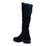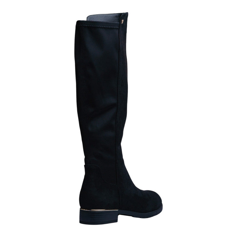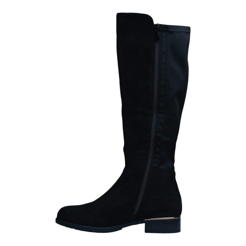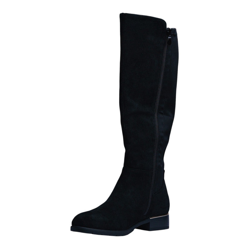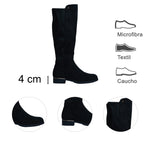 La bota piso negra de microfibra es una pieza esencial que combina elegancia y practicidad en un solo diseño. Su silueta estilizada de caña alta aporta un toque sofisticado, mientras que los detalles metálicos discretos en el talón añaden un aire moderno y distintivo.