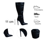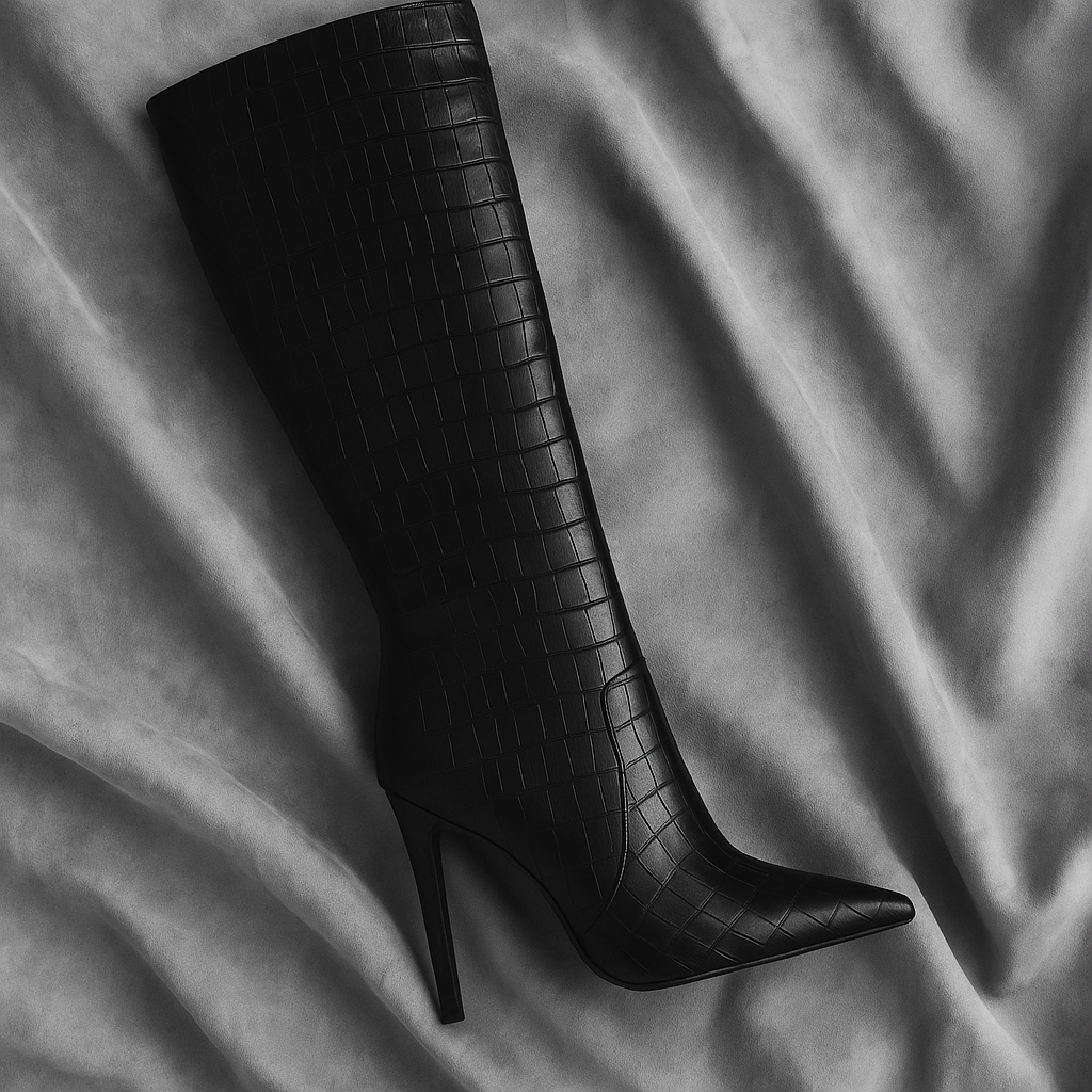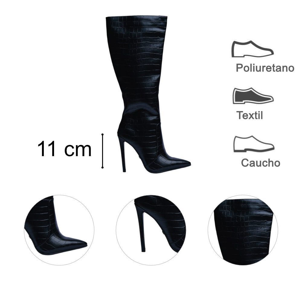 La bota alta negra con textura tipo cocodrilo es sinónimo de sofisticación y carácter. Su diseño estilizado con punta afilada y tacón de aguja de 11 cm aporta una silueta poderosa y elegante, ideal para quienes buscan un look moderno y con personalidad.
