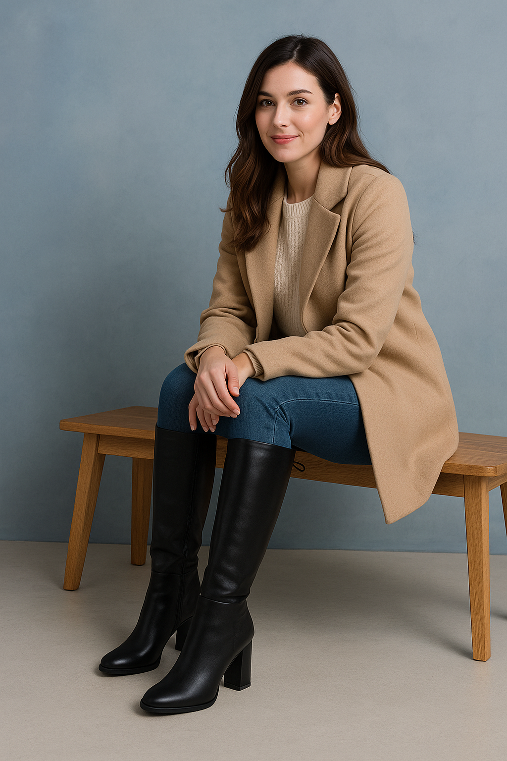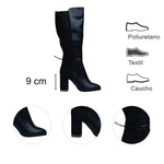 Esta bota alta en color negro está diseñada para quienes buscan un equilibrio perfecto entre estilo sofisticado y comodidad. Su silueta estilizada con acabado en poliuretano de alta calidad se combina con un tacón ancho de 9 cm, brindando altura y seguridad en cada paso.