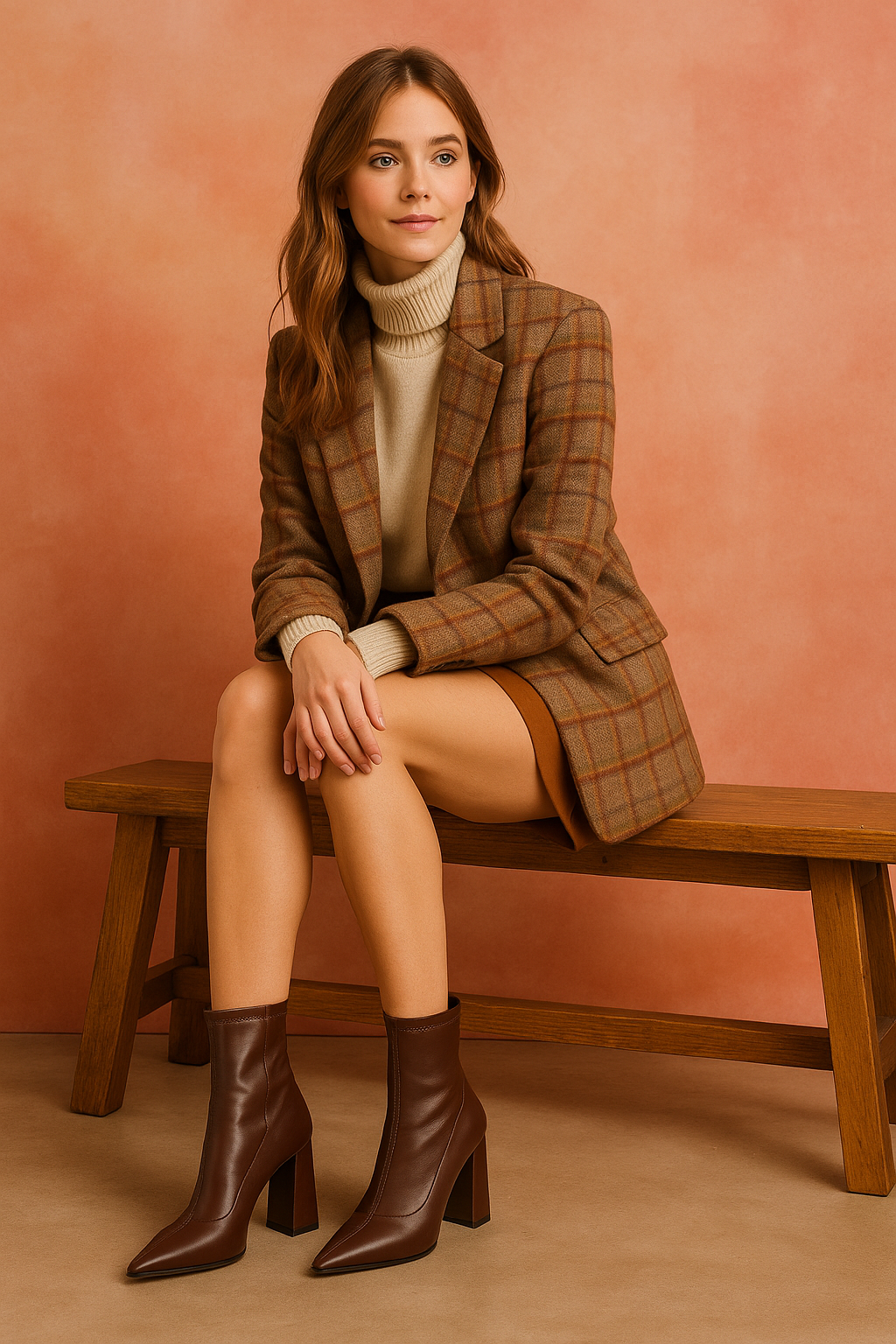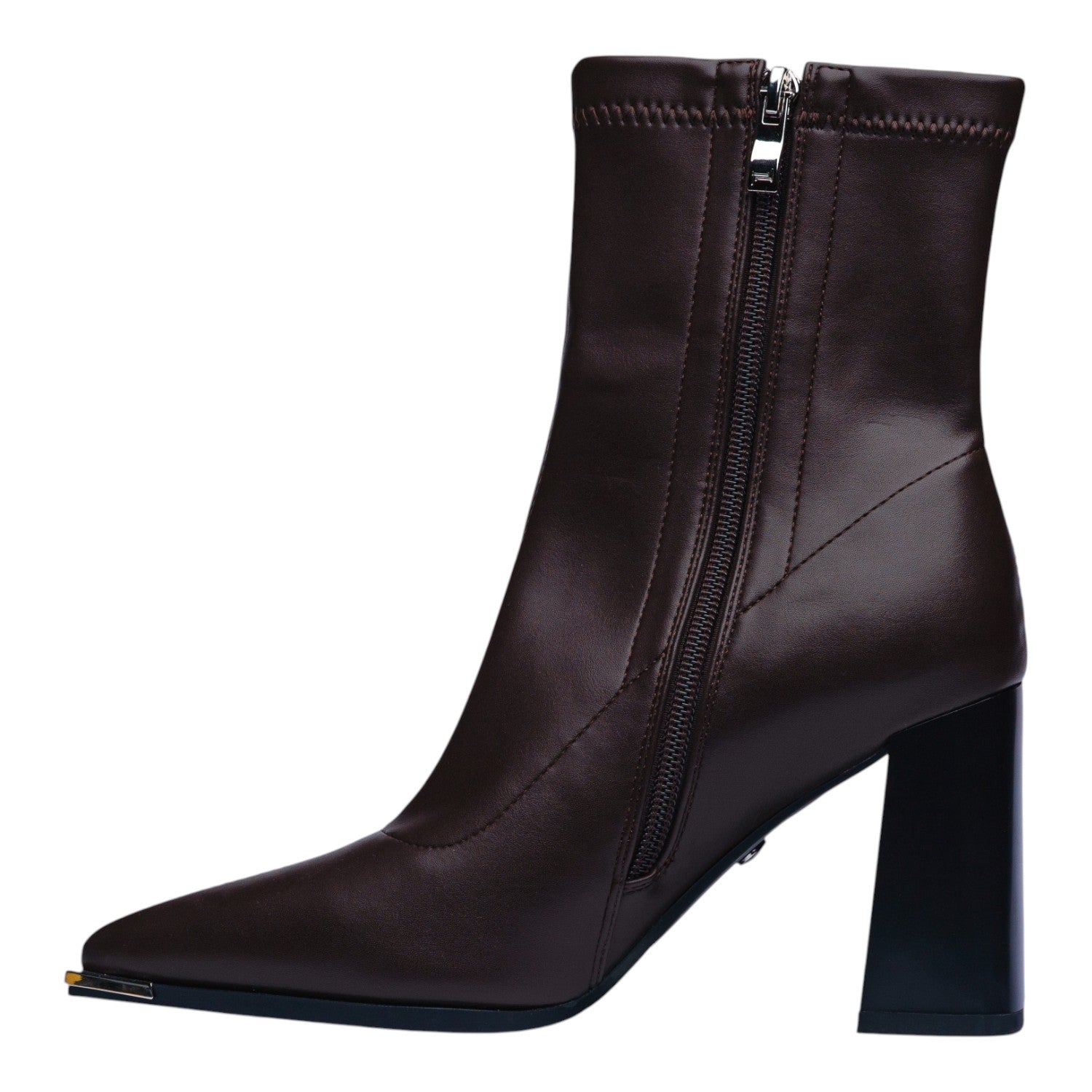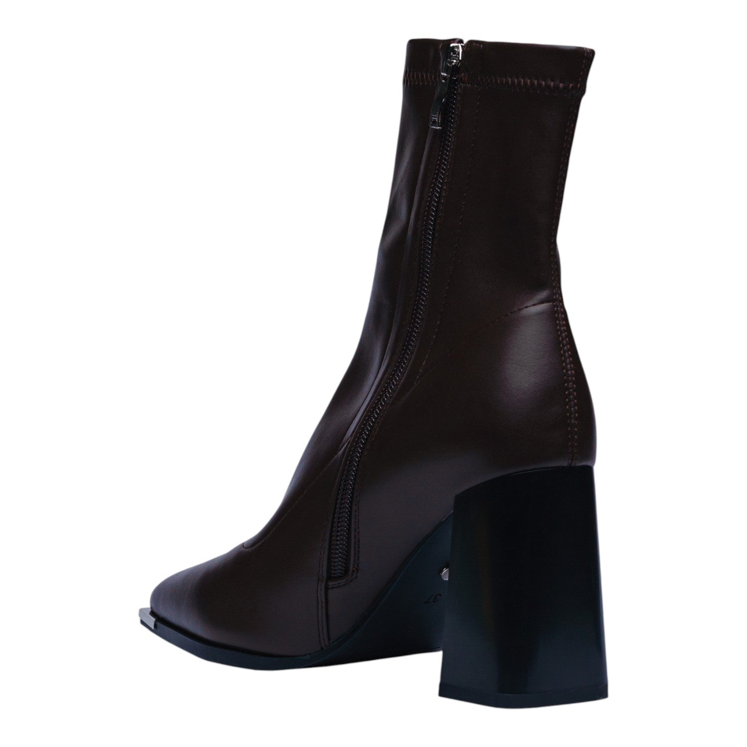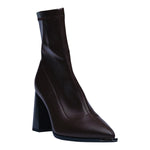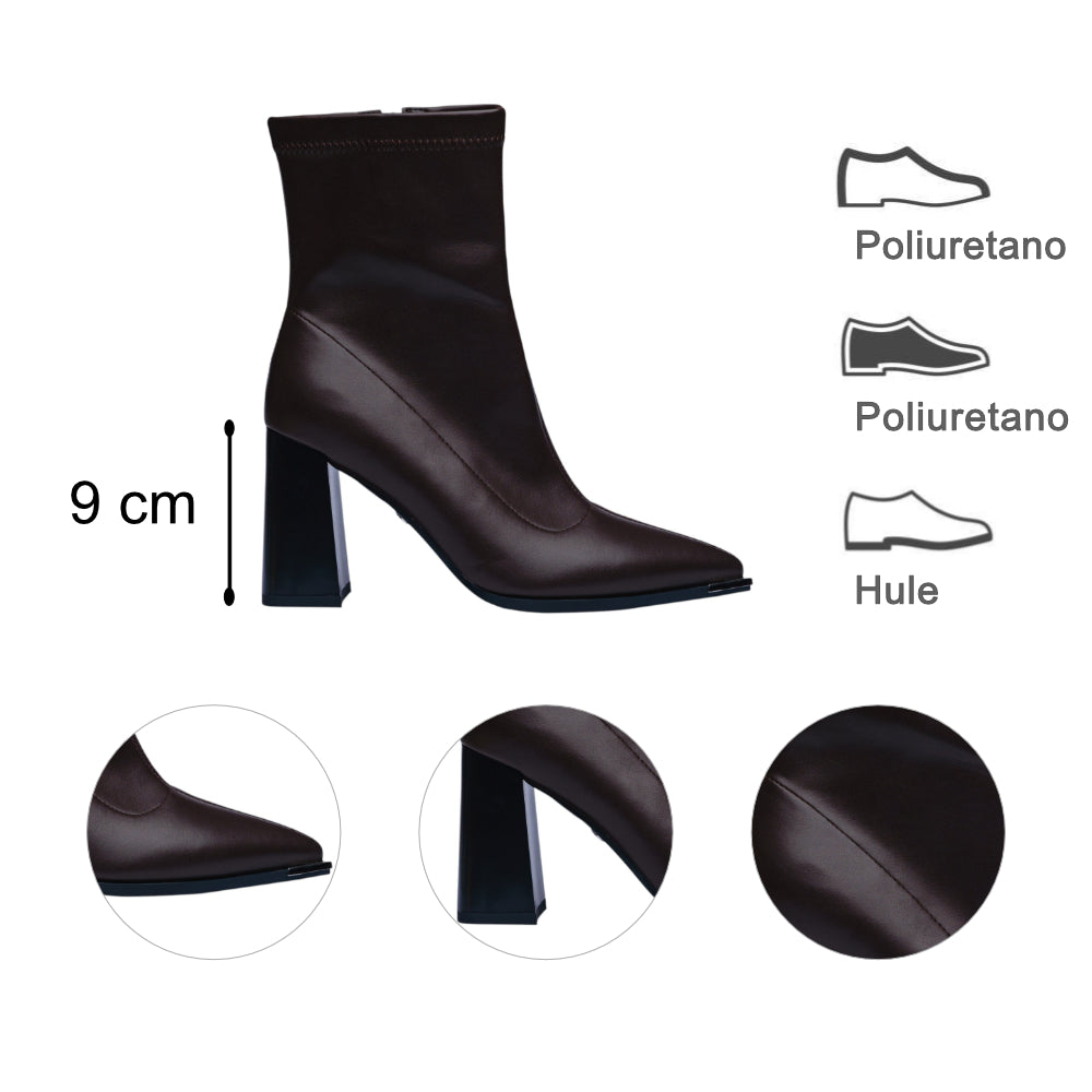 Este botín en color café destaca por su diseño elegante y minimalista que estiliza la figura en cada paso. Su punta fina y acabado liso en poliuretano le dan un aire sofisticado, mientras que el tacón ancho de 9 cm aporta altura y seguridad, logrando un balance perfecto entre estilo y comodidad.