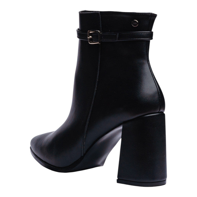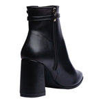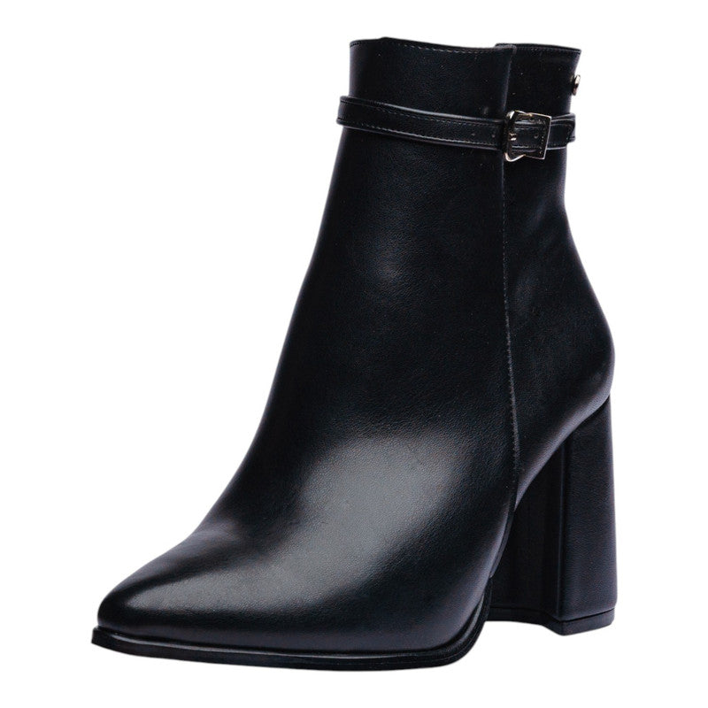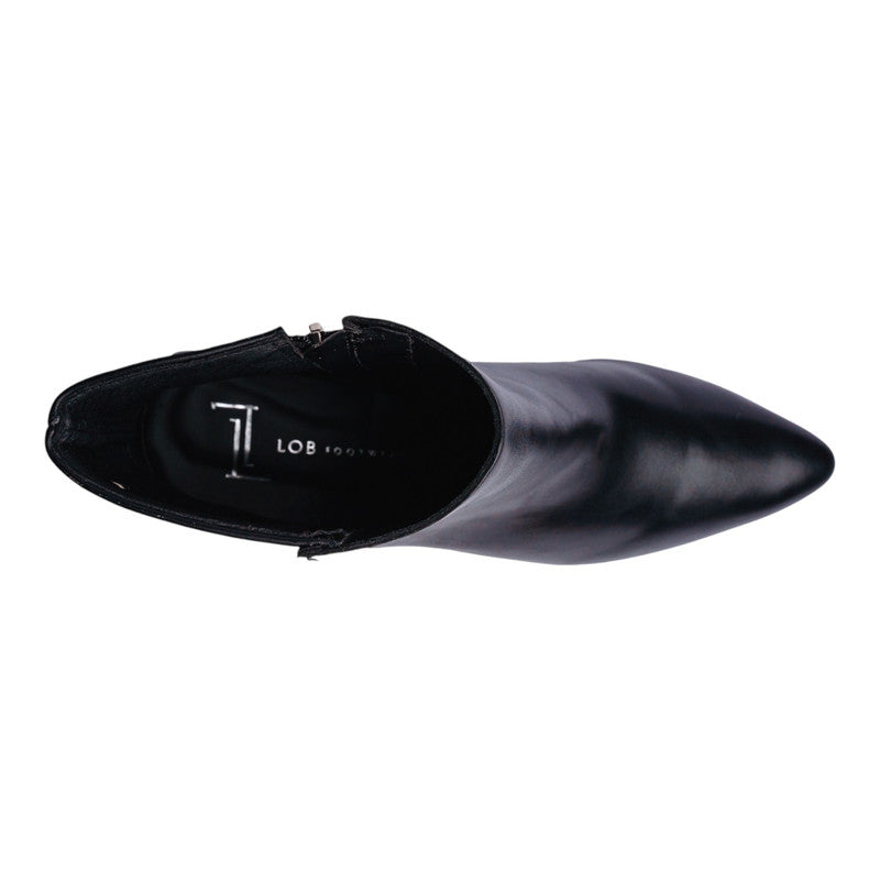 Botín para dama en color negro con un diseño elegante y estilizado que aporta sofisticación a cualquier look. Su silueta de punta fina y el tacón ancho de 9.5 cm estilizan la figura, manteniendo al mismo tiempo comodidad y seguridad en la pisada.