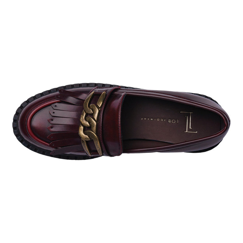 Este brogue en tono burgundy es la elección perfecta para quienes buscan un calzado que combine distinción y comodidad. Su acabado brillante y elegante se complementa con un detalle metálico dorado al frente y flecos decorativos que aportan un aire sofisticado y moderno, ideal para destacar en cualquier ocasión.