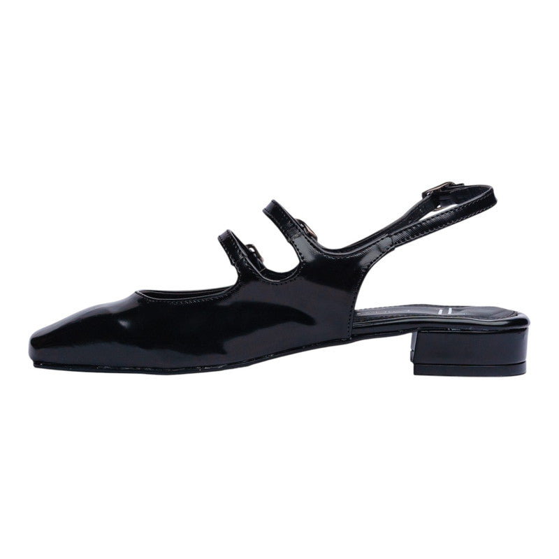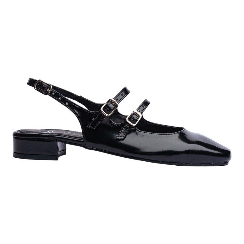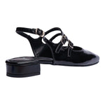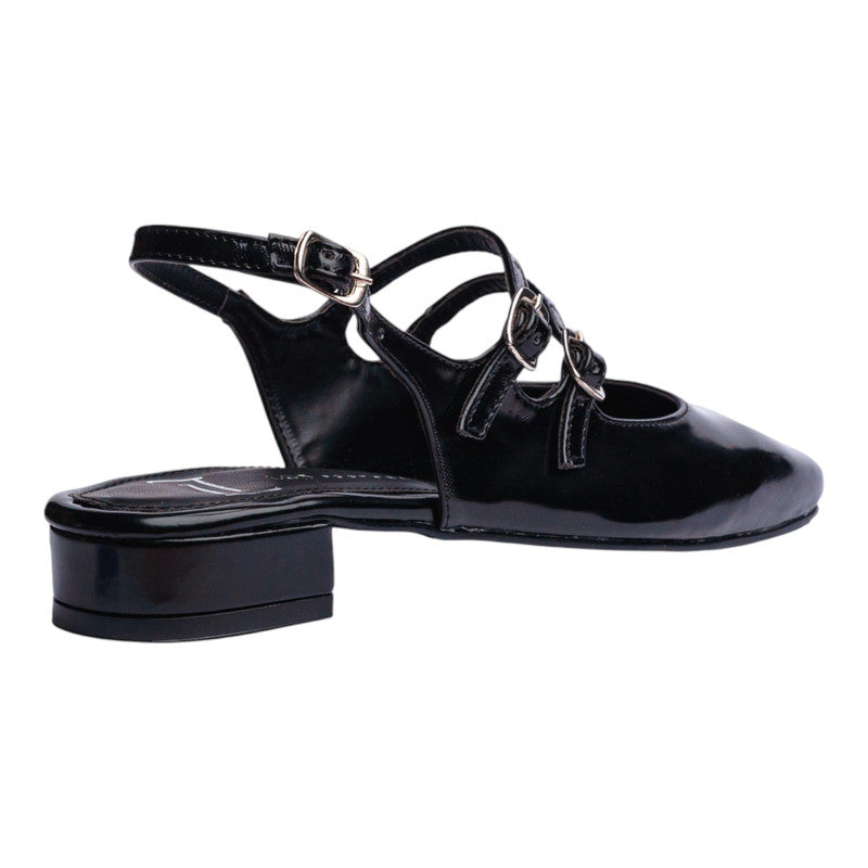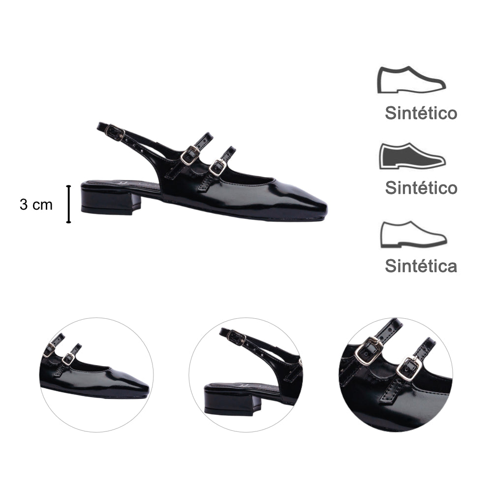 Ballerina para dama en color negro con acabado brillante que aporta un estilo sofisticado y moderno. Su diseño destaca por las múltiples correas delgadas con hebillas metálicas, un detalle elegante que no solo realza su estética, sino que también brinda un ajuste seguro y cómodo.