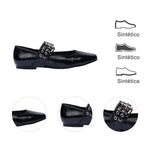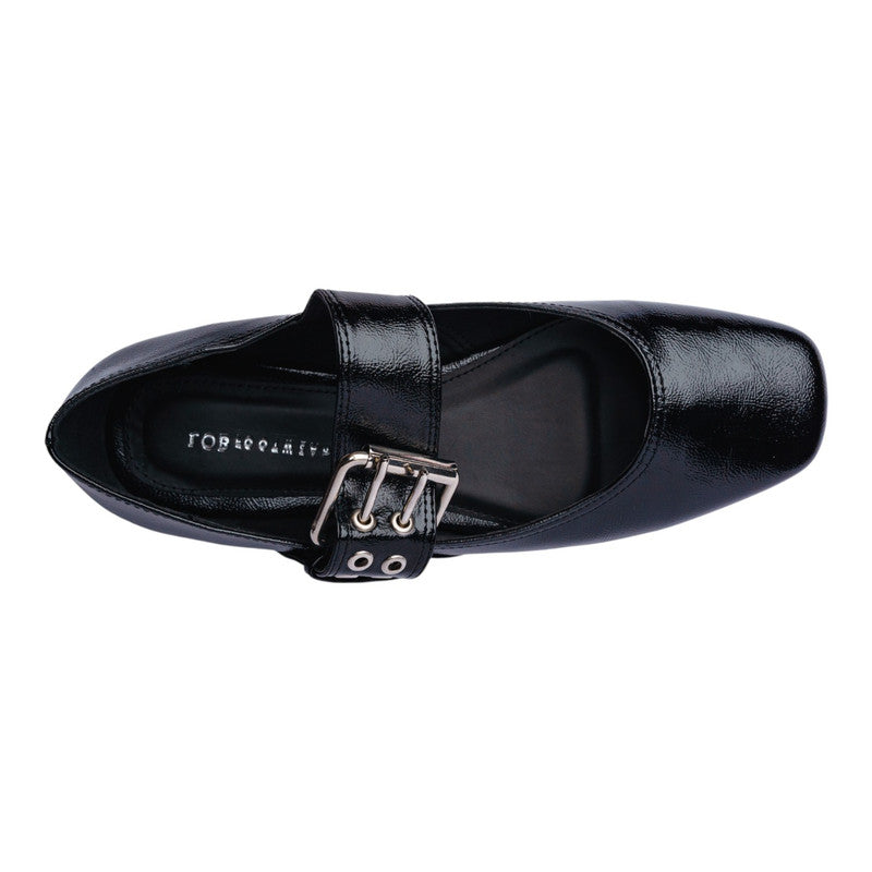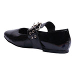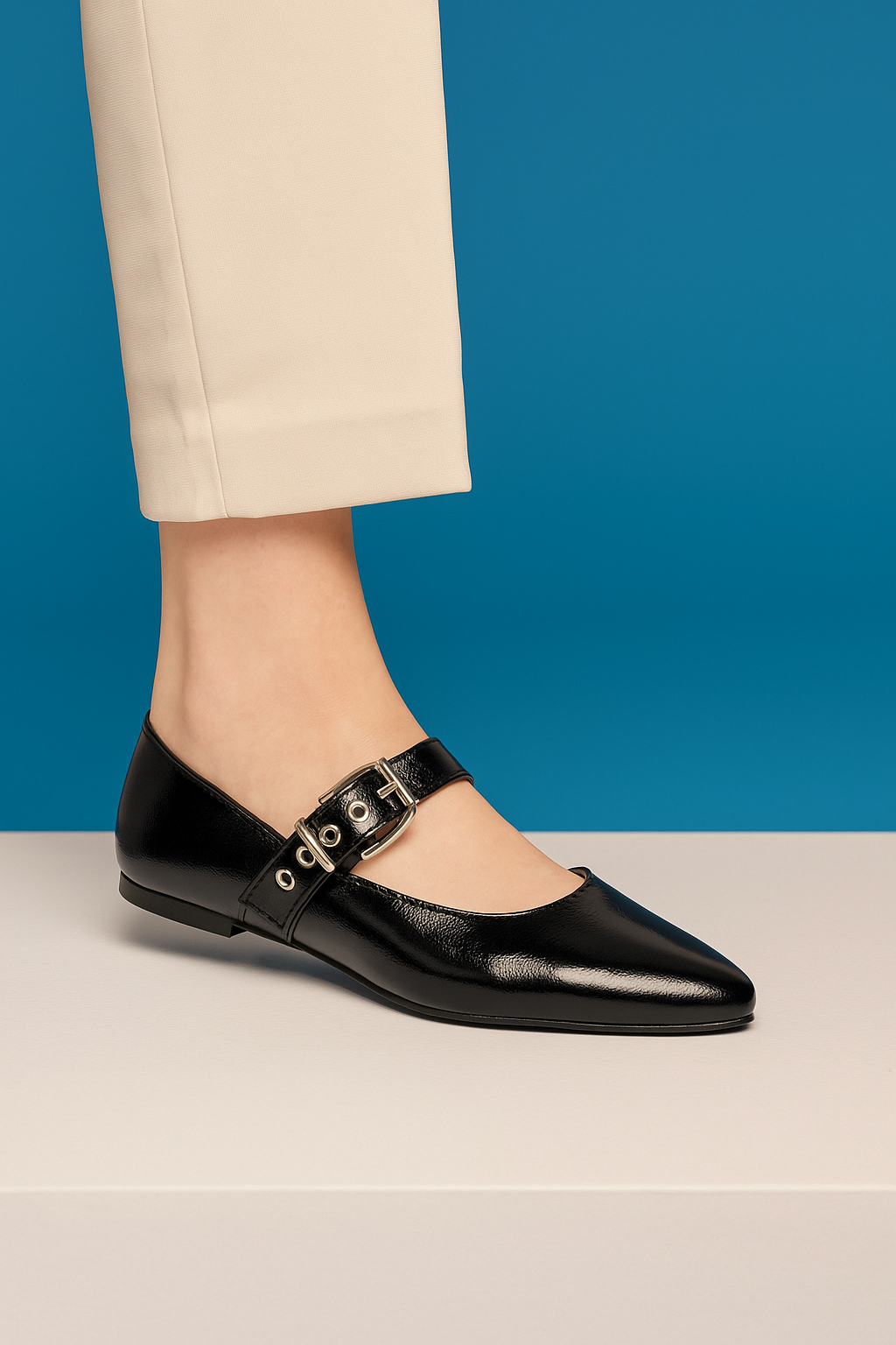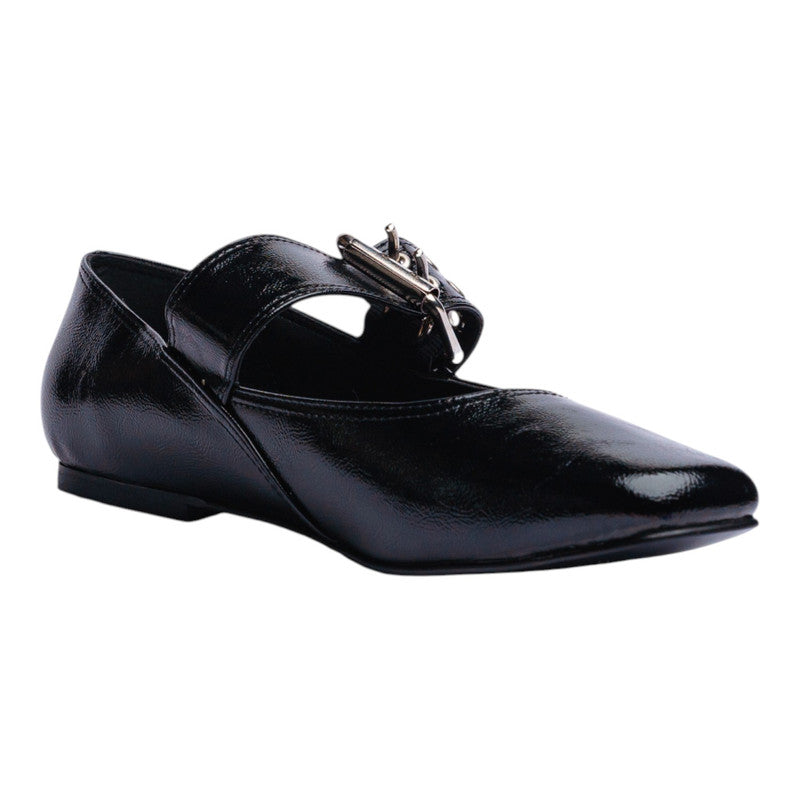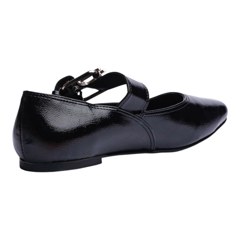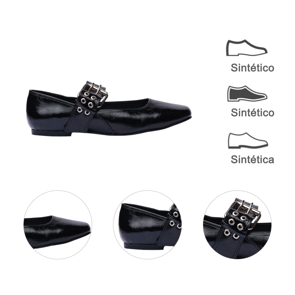 Ballerina para dama en color negro, con acabado brillante que aporta un toque elegante y moderno. Su diseño destaca por la correa ancha en el empeine con hebilla metálica plateada y ojillos decorativos, un detalle audaz que combina estilo y carácter.