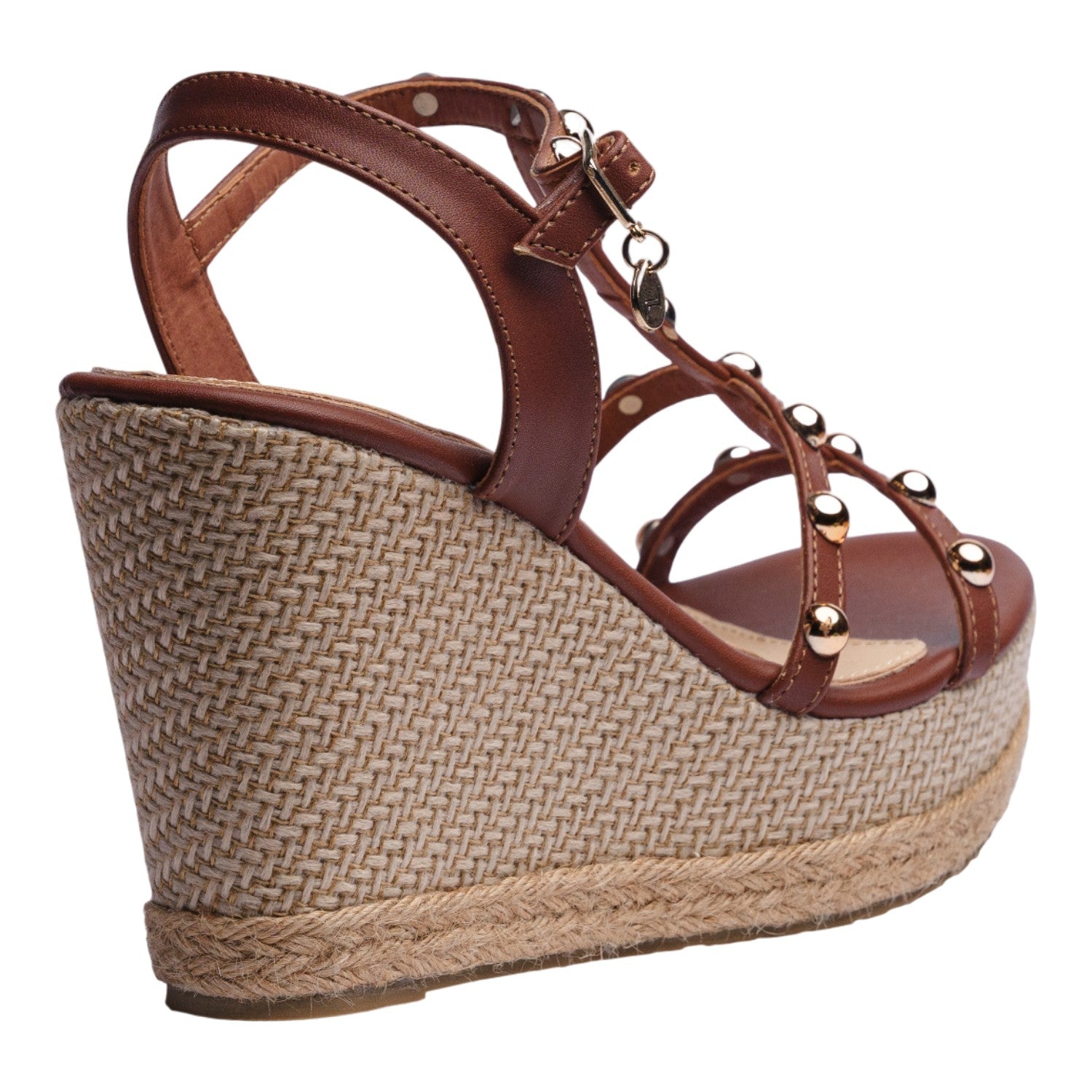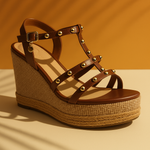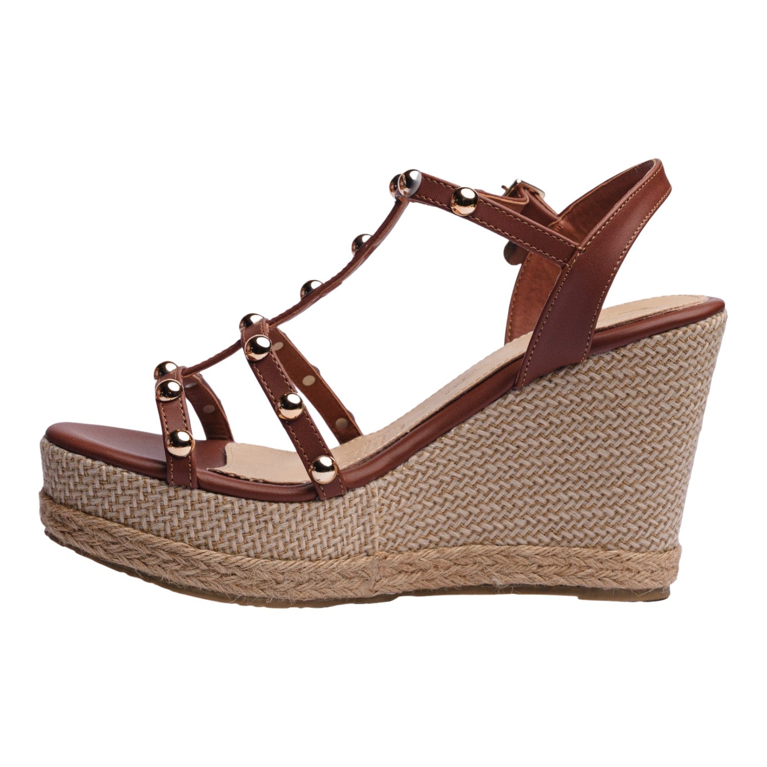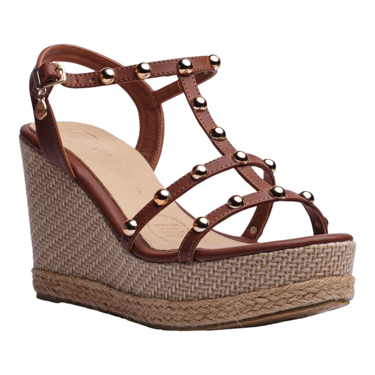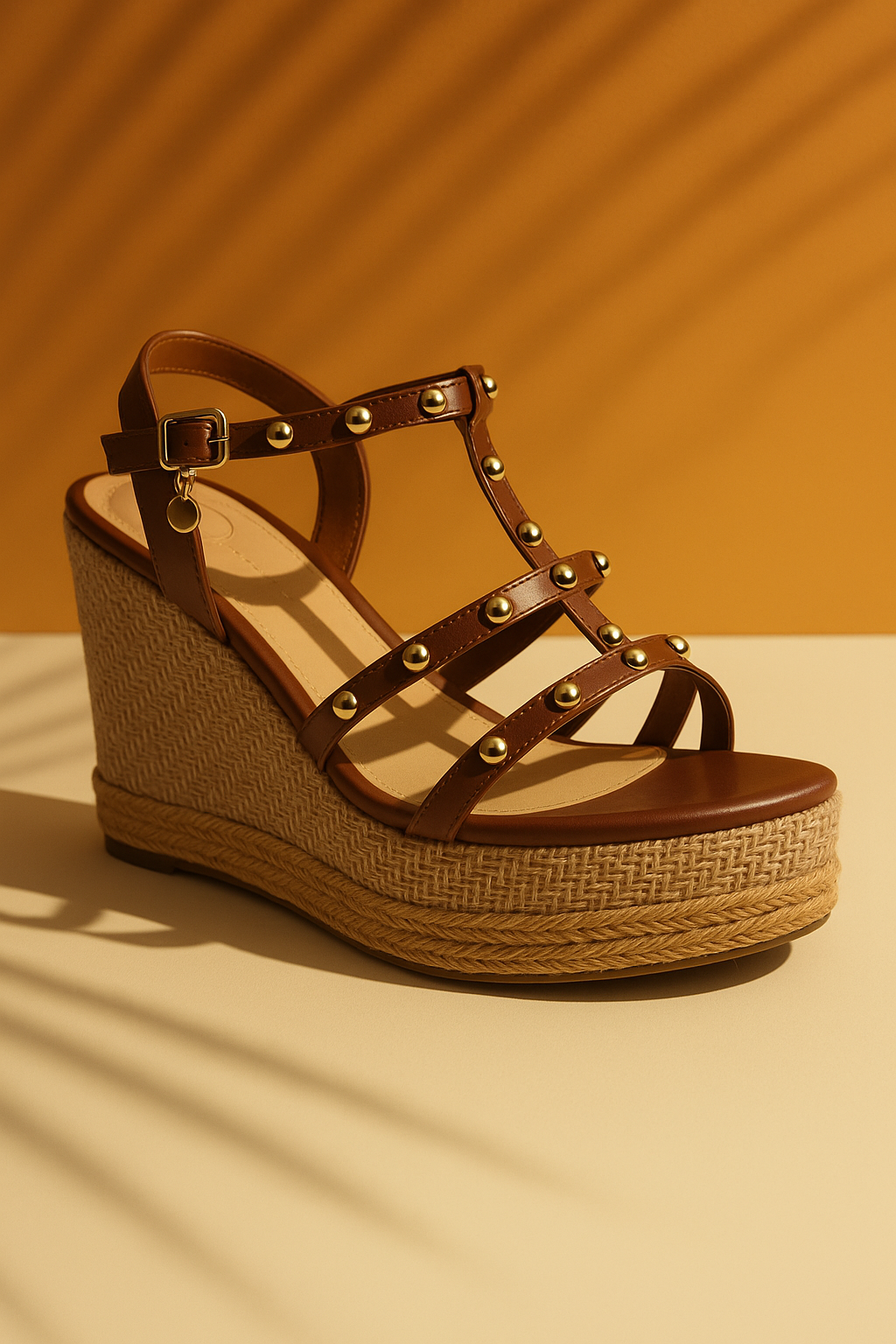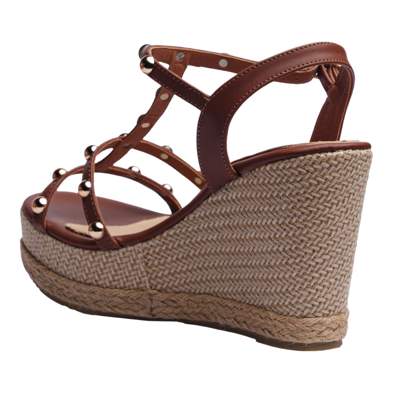Sandalia cuña para dama en color tan, con un diseño llamativo y sofisticado. Su estructura de tiras delgadas está adornada con estoperoles metálicos dorados, que aportan un toque moderno y elegante sin perder la comodidad. La pulsera con hebilla ajustable asegura un calce firme y seguro en cada paso.