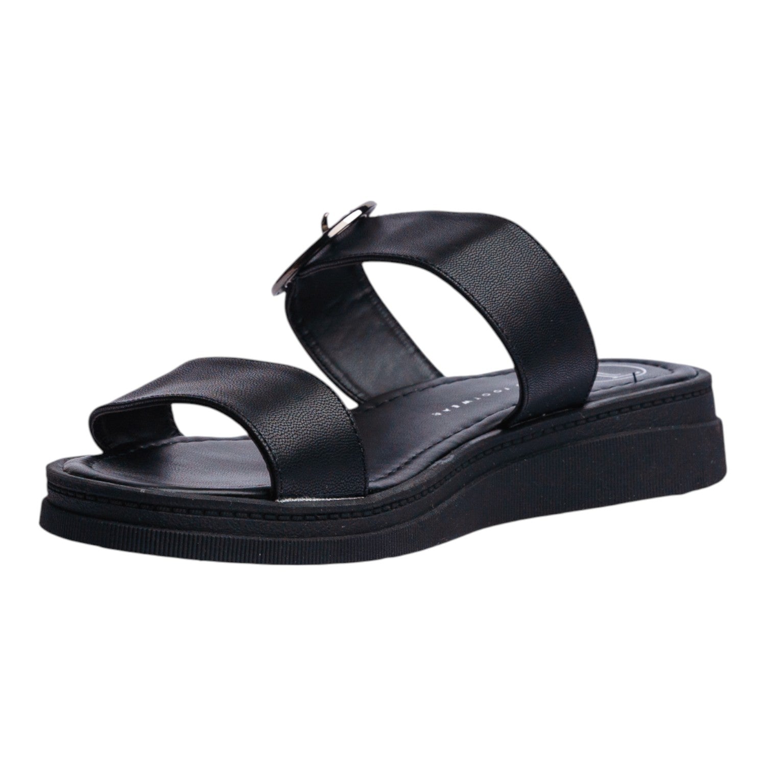 Sandalia cuña en color negro, diseñada para brindar estilo y confort en cada paso. Su diseño minimalista se realza con la presencia de una hebilla metálica redonda al costado, un detalle moderno que aporta un toque sofisticado y actual.