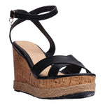 Sandalia cuña para dama en color negro con tiras cruzadas que aportan un estilo sofisticado y atemporal. Su diseño elegante combina perfectamente con la frescura del acabado en corcho y el detalle en yute, logrando un equilibrio entre modernidad y naturalidad.