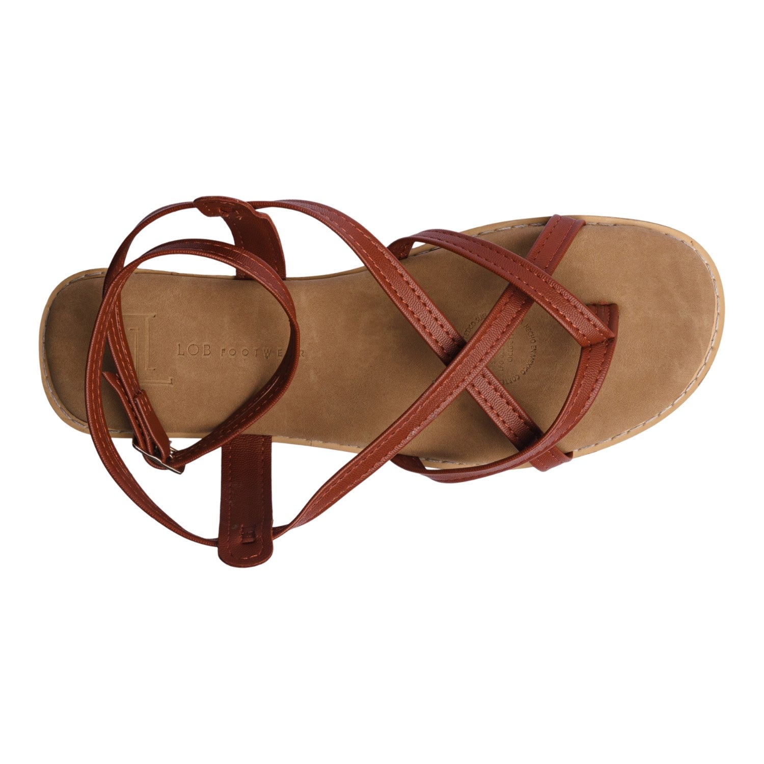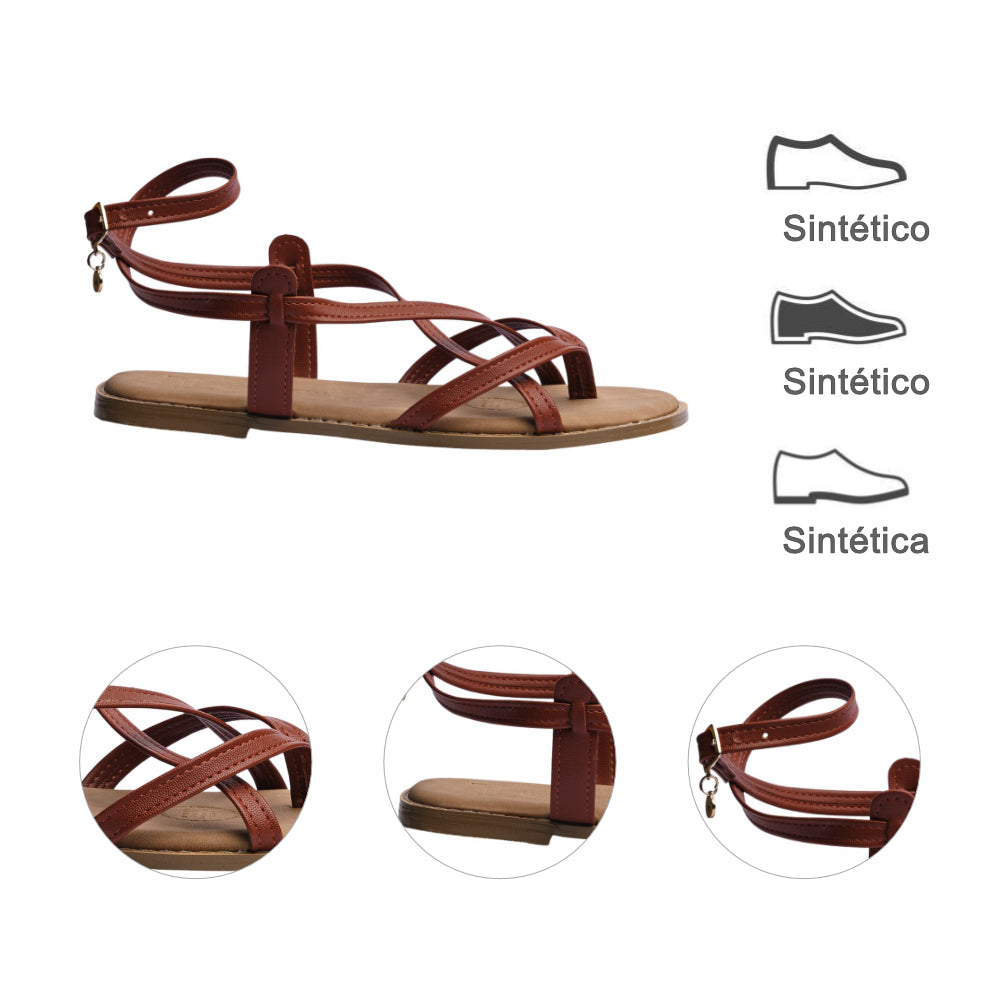 Sandalia piso para dama en color tan con un diseño moderno y práctico que combina estilo y comodidad en cada paso. Sus tiras cruzadas crean un efecto visual elegante mientras aseguran un ajuste firme y confortable, complementado con una hebilla metálica al costado que permite mayor seguridad y personalización en la sujeción.