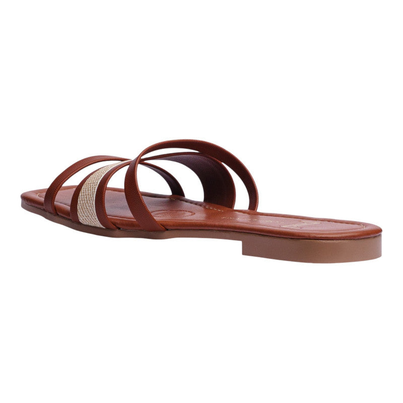 Sandalia piso para dama en color tan, diseñada para ofrecer frescura, ligereza y un estilo versátil que se adapta a cualquier ocasión. Su diseño de tiras finas en acabado sintético se combina con un detalle texturizado en tono beige al centro, que le aporta un contraste moderno y elegante.