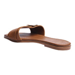 Sandalia piso para dama en color tan, vibrante, diseñada para darle energía y estilo a tus outfits de temporada. Su corte limpio y la tira ancha frontal destacan por el detalle metálico circular en tono dorado, que aporta un aire moderno y sofisticado sin perder frescura.