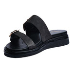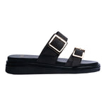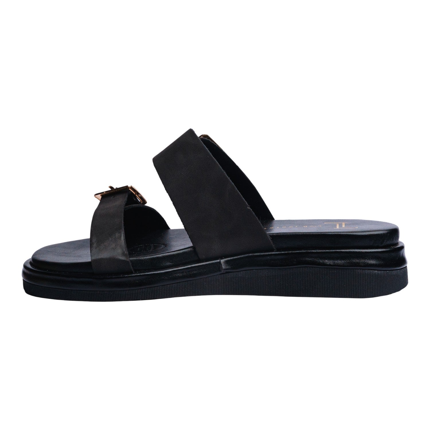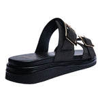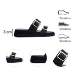 Sandalia piso para dama en color negro, diseñada para ofrecer un balance perfecto entre estilo y comodidad. Su diseño cuenta con dos tiras anchas ajustables adornadas con hebillas metálicas doradas, que no solo elevan su estética moderna y elegante, sino que también permiten un ajuste seguro y personalizado.