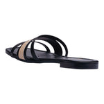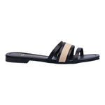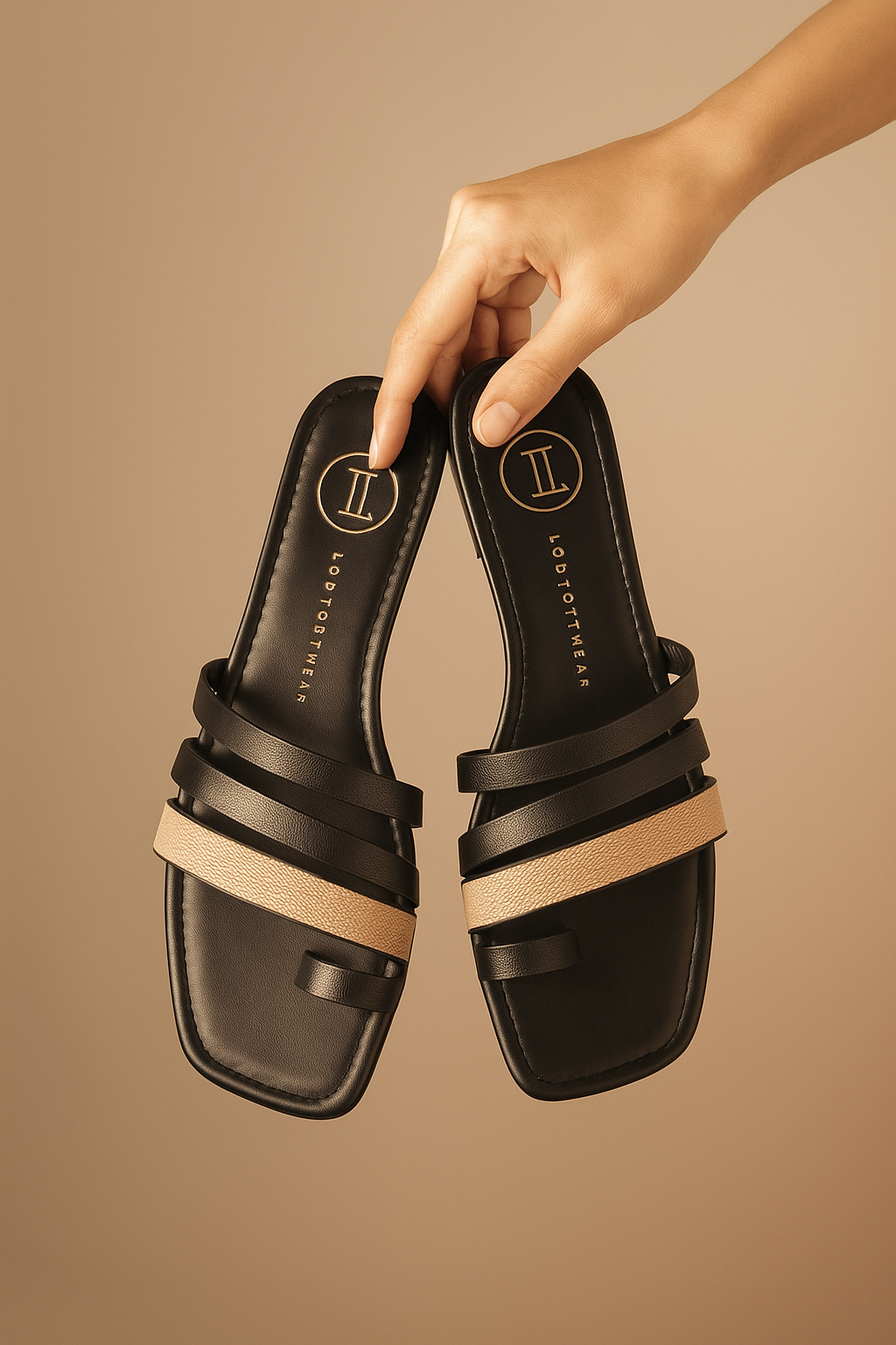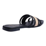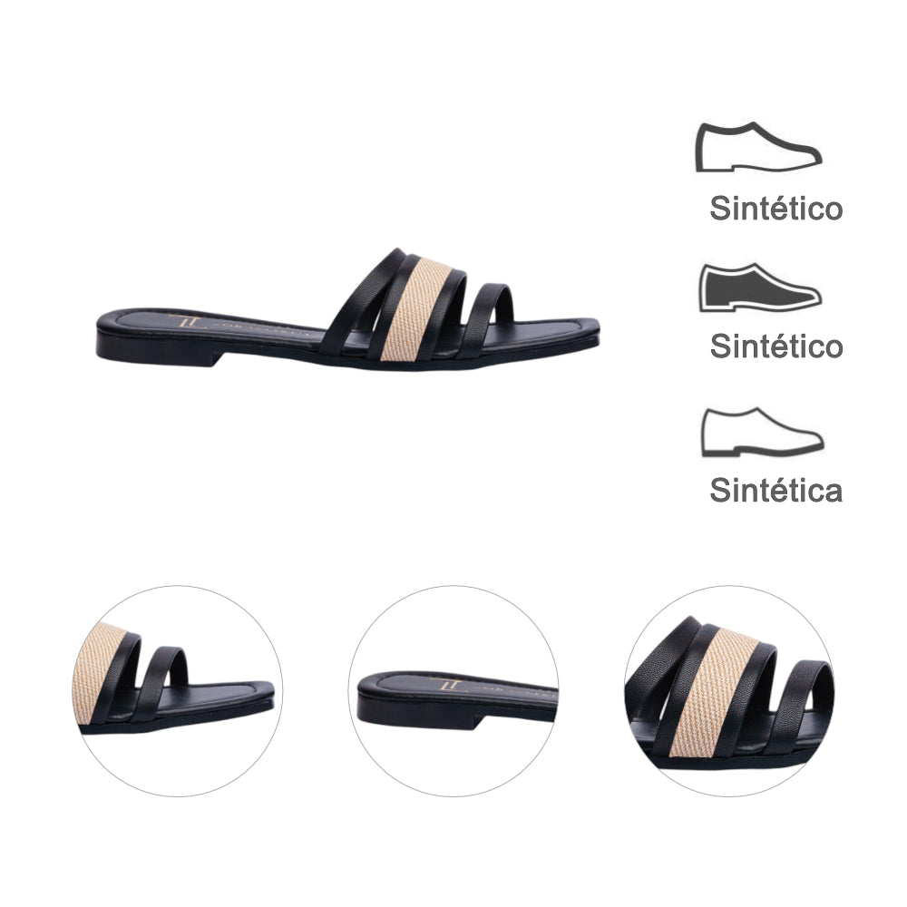 Sandalia piso para dama en color negro, un diseño fresco y moderno que combina elegancia y comodidad en cada paso. Sus tiras finas se complementan con un detalle central en tono beige texturizado, creando un contraste sofisticado que aporta personalidad al calzado.