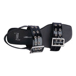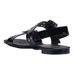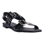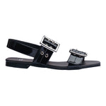 Esta sandalia de piso en color negro está diseñada para ofrecerte un estilo moderno y audaz sin dejar de lado la comodidad. Su diseño con tiras anchas al frente se realza con dos hebillas metálicas plateadas de gran tamaño y ojillos decorativos, que le otorgan un toque urbano sofisticado.