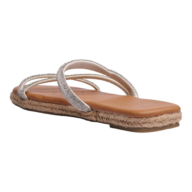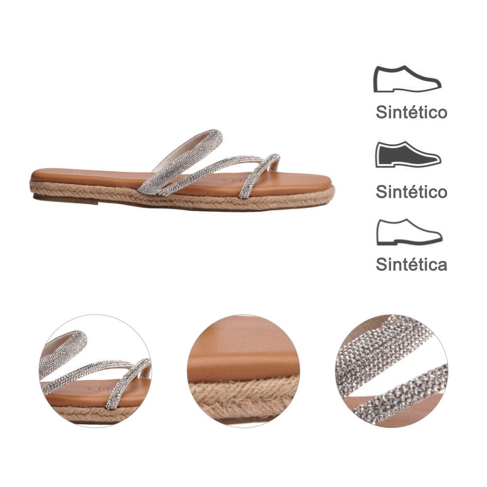 Sandalia piso para dama en color plateado con diseño minimalista y elegante. Sus tiras delgadas están decoradas con aplicaciones brillantes que capturan la luz en cada movimiento, aportando un toque glamuroso sin perder frescura y ligereza.