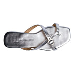 Minimalista y sofisticada, esta sandalia en tono plateado es el complemento perfecto para quienes buscan estilo y frescura en un diseño versátil. Sus tiras delgadas con acabado metálico y detalle de hebilla añaden un aire moderno y femenino que realza cualquier look, desde outfits casuales hasta combinaciones más elegantes.