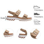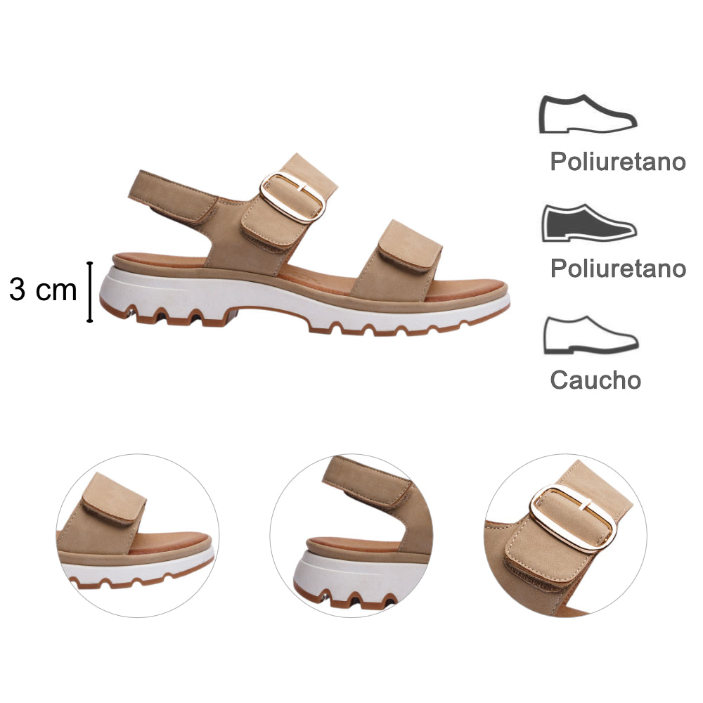 Sandalia piso para dama en color beige, diseñada con tiras anchas y hebilla metálica dorada que le aporta un detalle moderno y elegante. Su diseño combina practicidad y estilo, ofreciendo un ajuste seguro y cómodo para el uso diario.