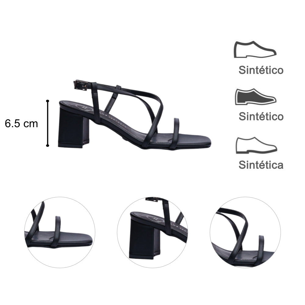 El acabado sintético en tono negro la convierte en una pieza versátil, ideal para llevar tanto en eventos formales como en looks casuales con un toque sofisticado. Su tacón ancho de 6.5 cm ofrece la altura perfecta para estilizar tu figura sin comprometer la comodidad.