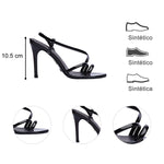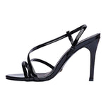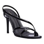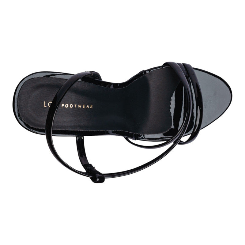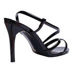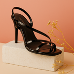 Sandalia de tacón alto en color negro con acabado brillante, pensada para mujeres que buscan un equilibrio entre sofisticación y estilo. Su diseño de tiras delgadas cruzadas aporta un aire moderno y sensual, realzando el pie con elegancia en cada paso.
