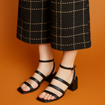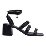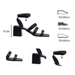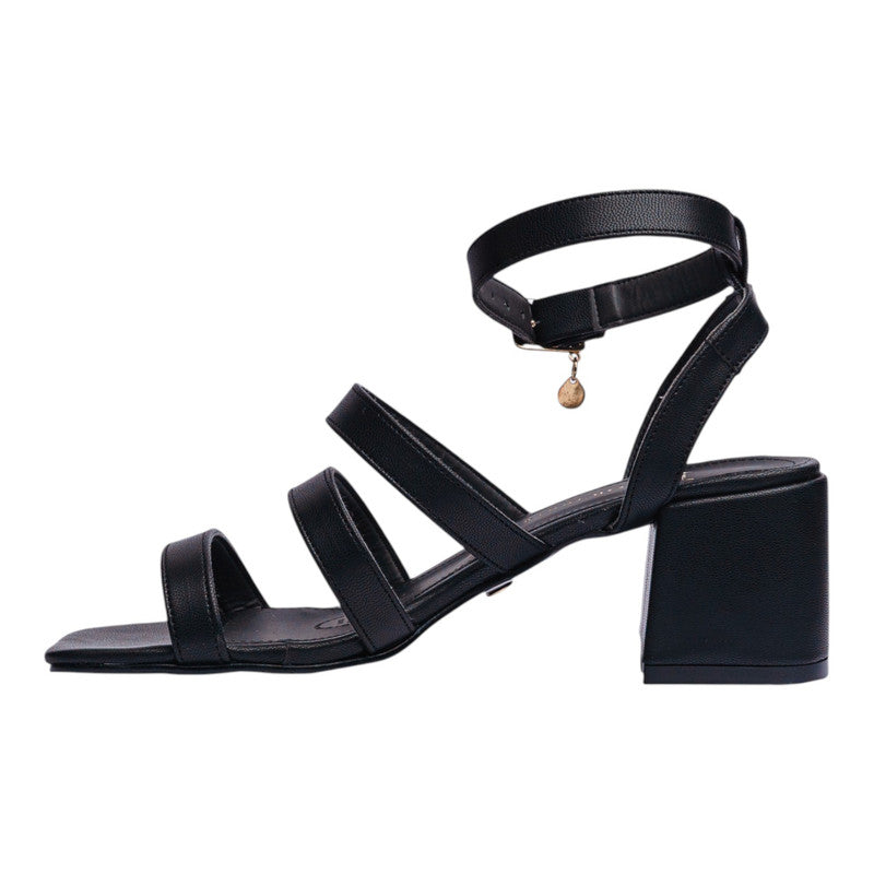 Esta sandalia negra de tacón medio es la definición de un estilo versátil y moderno que se adapta a cualquier ocasión. Su diseño con tres delicadas tiras frontales y pulsera ajustable al tobillo aporta seguridad y un ajuste perfecto, mientras realza el pie con un aire minimalista y sofisticado.