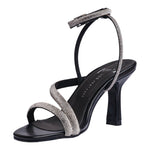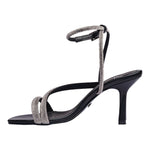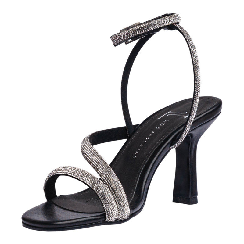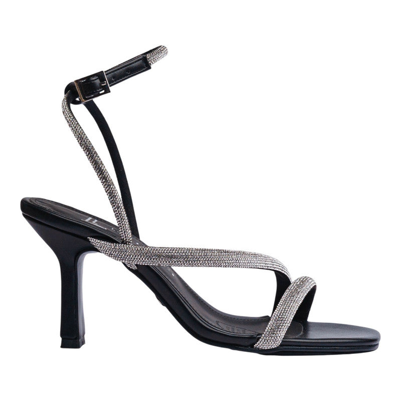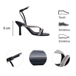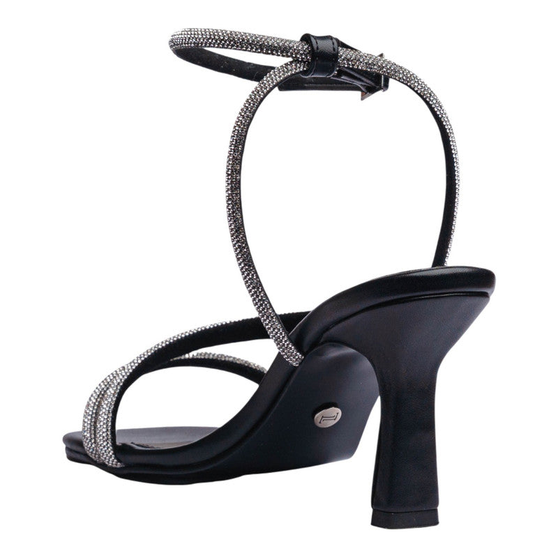 Sandalia de tacón para dama en color negro, diseñada para resaltar con elegancia y sofisticación en cada ocasión. Su diseño con tiras delgadas adornadas con pedrería aporta un brillo sutil y glamuroso, ideal para destacar en eventos de noche o reuniones especiales.