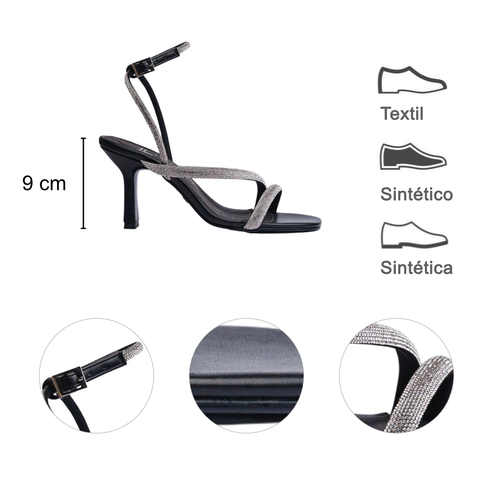 El contraste de su base negra con los destellos de las piedras refleja un estilo moderno premium, mientras que su pulsera con hebilla ajustable asegura un calce firme y cómodo. Su tacón de 9 cm estiliza la silueta, ofreciendo una altura que combina impacto visual y seguridad al caminar.