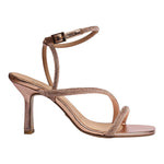 Sandalia de tacón para dama en color rose gold, pensada para quienes buscan un calzado elegante que combine estilo y comodidad. Su diseño de tiras delgadas con destellos brillantes realza el pie con sofisticación, aportando un toque glamuroso ideal para eventos especiales o salidas nocturnas.