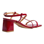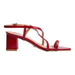 Sandalia de tacón para dama en color rojo brillante, diseñada para destacar con un estilo moderno y femenino. Su diseño con tiras delgadas entrecruzadas y pulsera ajustable en el tobillo no solo realza la silueta del pie, sino que también brinda seguridad y firmeza en cada paso.