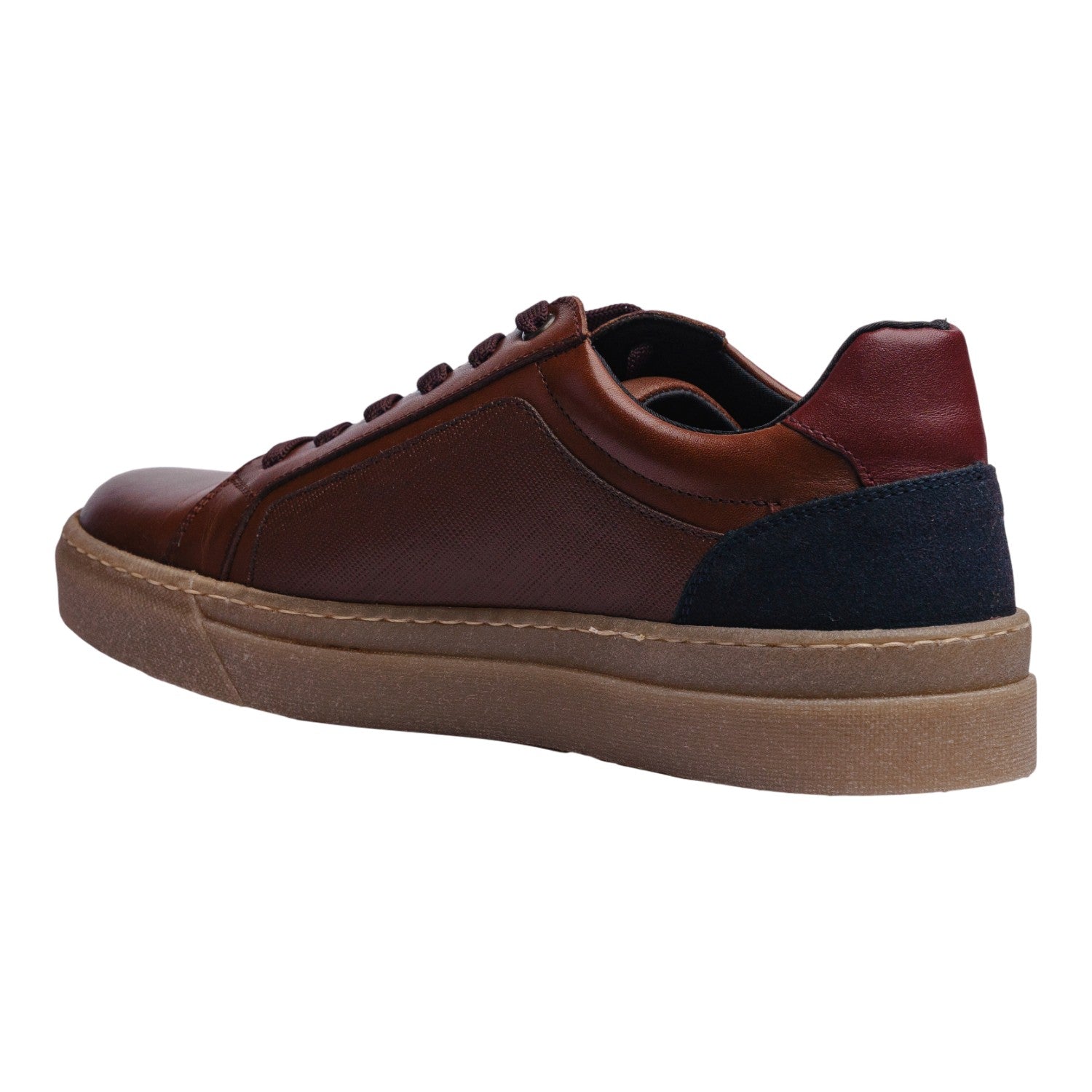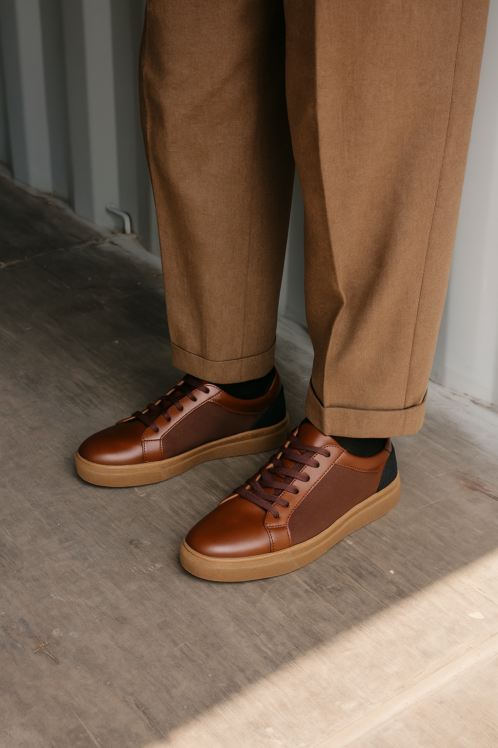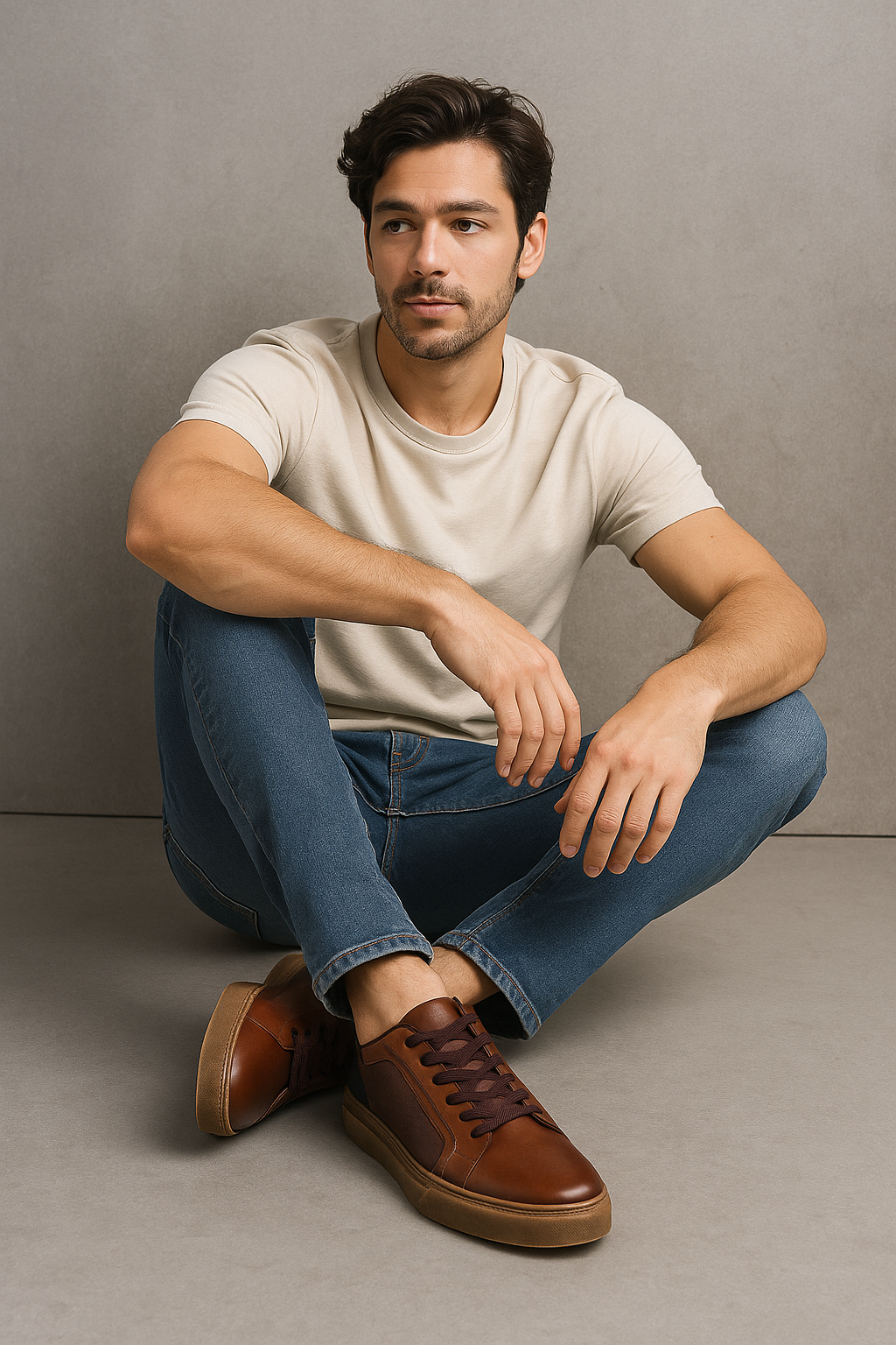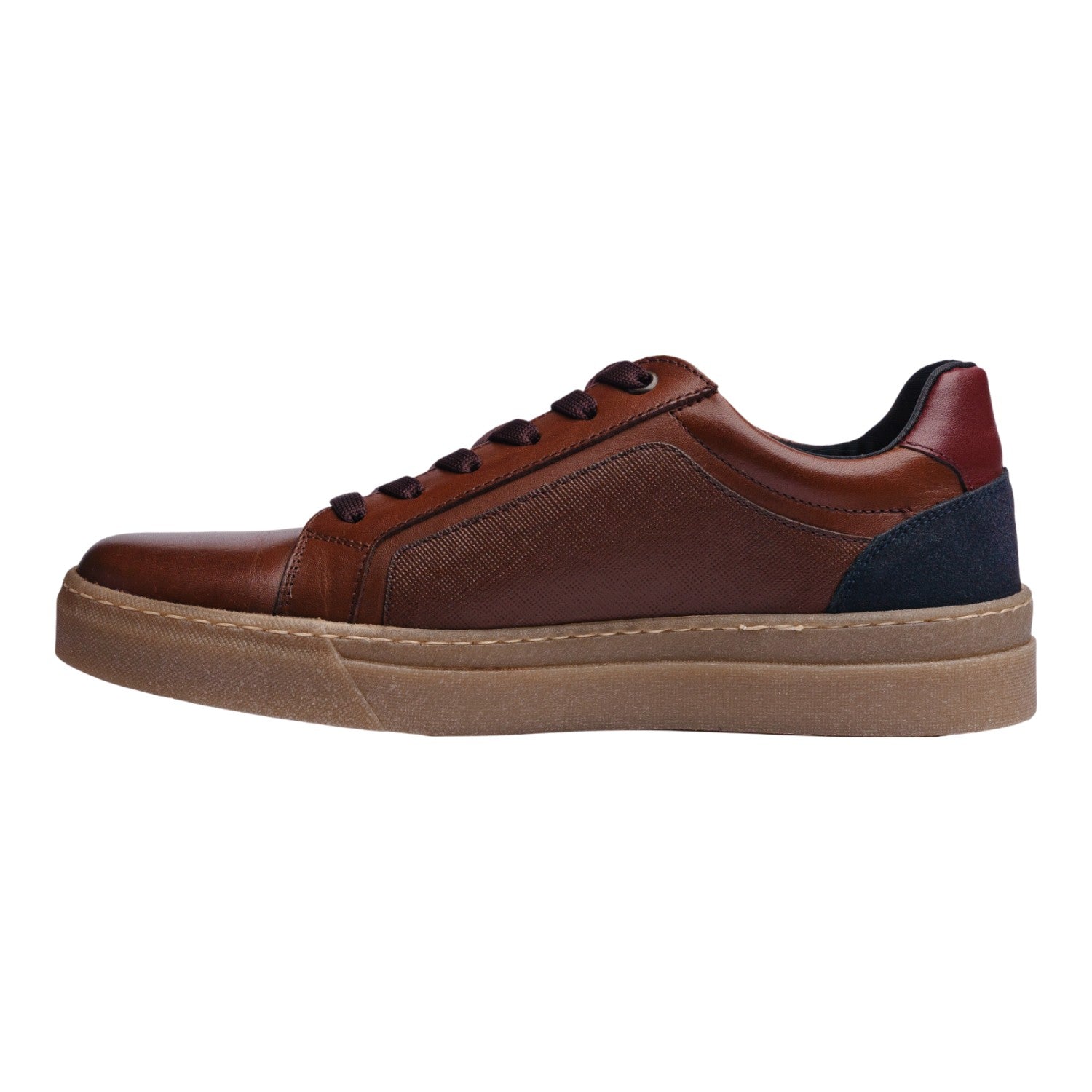 Este tenis para caballero combina la sofisticación del corte en piel vacuno con un diseño urbano y moderno. Su tono nuez con detalles en contraste en el talón resalta un estilo versátil que se adapta fácilmente a looks casuales o semiformales. Los acabados cuidados y su silueta limpia lo convierten en un calzado ideal para quienes buscan comodidad sin perder elegancia.