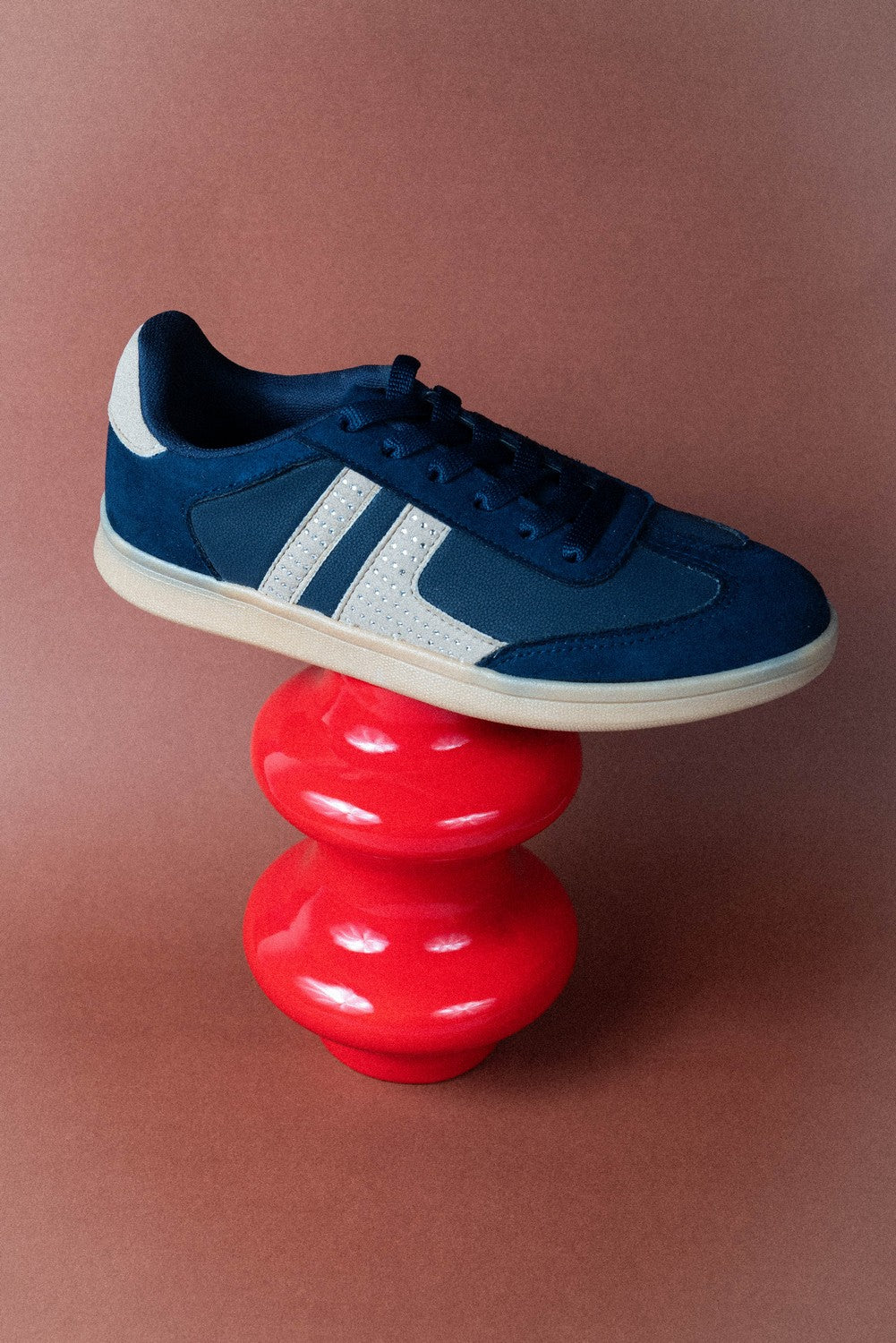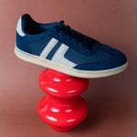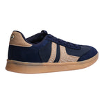 Tenis para dama azul marino, con un diseño moderno y casual que aporta frescura y estilo urbano. Su silueta clásica se complementa con franjas laterales en contraste, decoradas con aplicaciones que añaden un toque distintivo y contemporáneo.