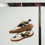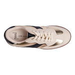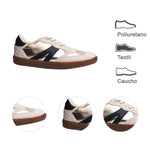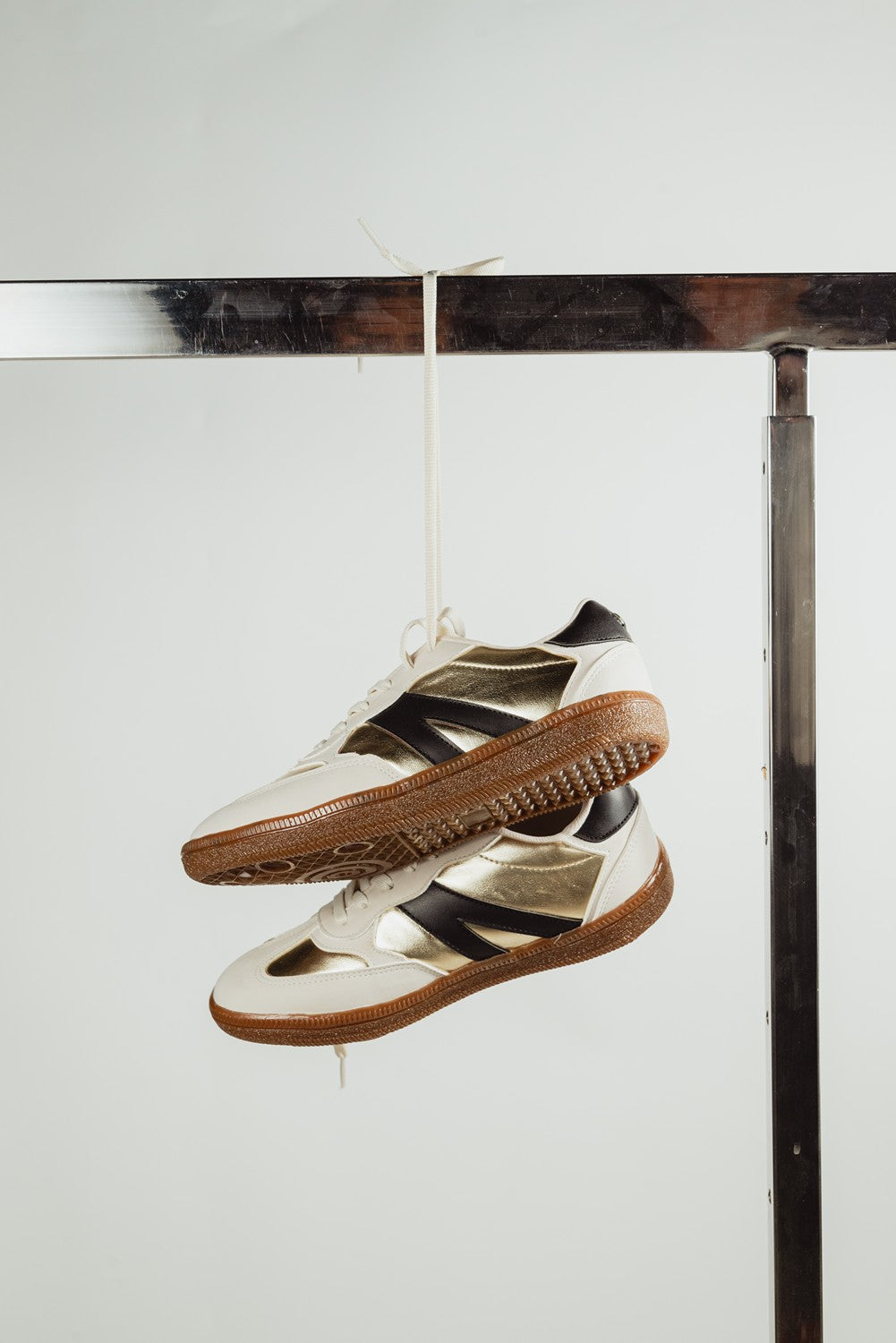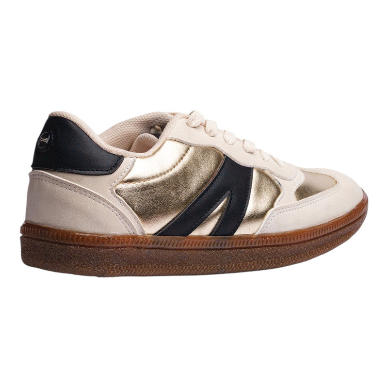 Tenis para dama en combinación de beige y dorado con detalle negro en los laterales, un diseño moderno que mezcla elegancia y estilo urbano. Su contraste de colores lo convierte en un calzado llamativo pero versátil, ideal para quienes buscan comodidad sin perder un toque sofisticado en su look.