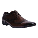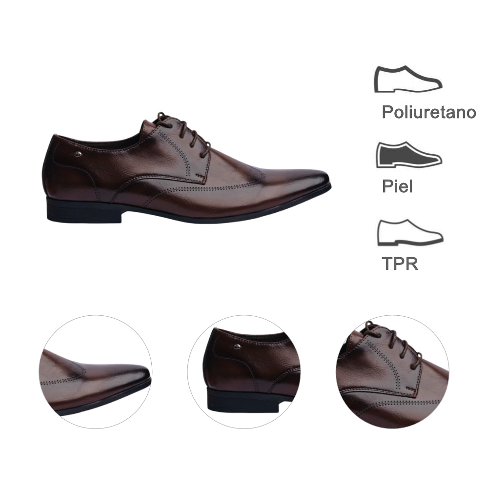 Zapato de vestir para caballero en color café, confeccionado en poliuretano de alta calidad con un diseño elegante y estilizado. Su silueta refinada con agujetas y delicados detalles de costura y perforaciones aportan un aire sofisticado y distintivo, ideal para quienes buscan proyectar seguridad y buen gusto.