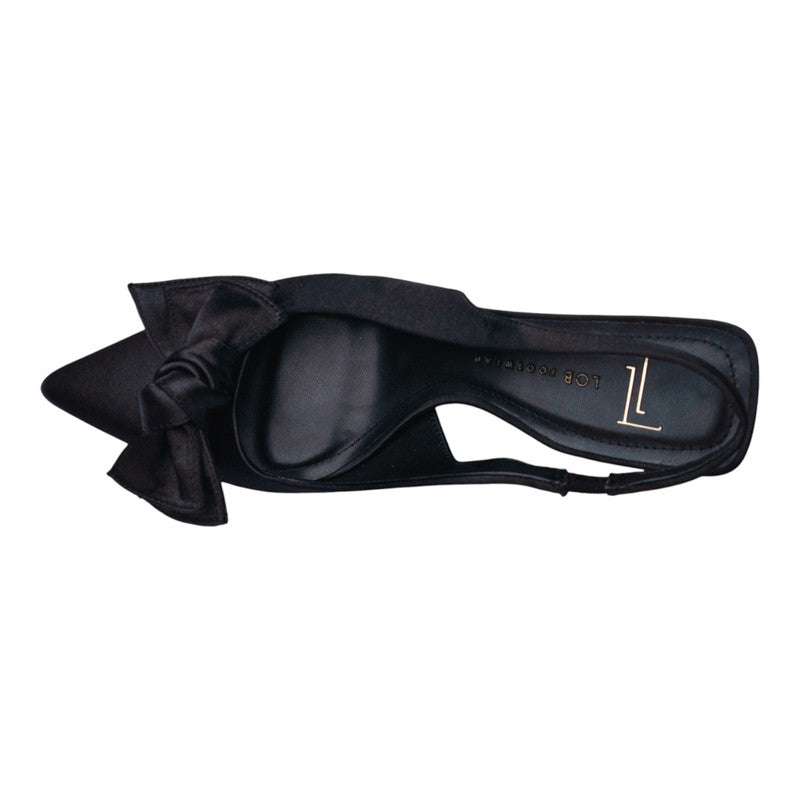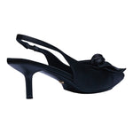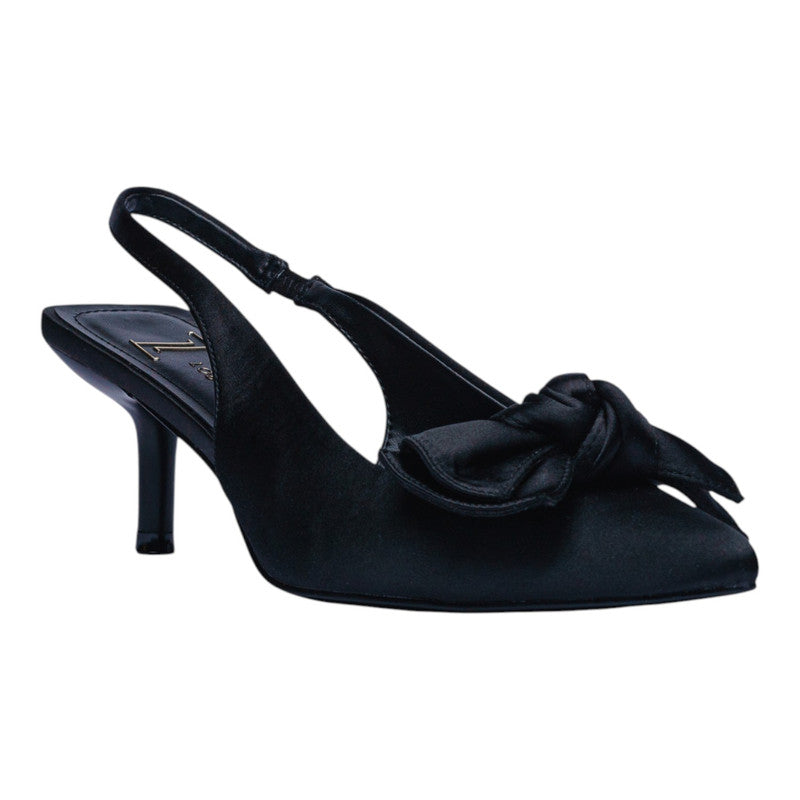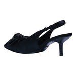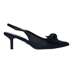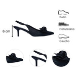 Esta zapatilla tipo pump slingback en satín negro es la definición de elegancia discreta y refinada. Su diseño con punta fina estiliza el pie, mientras que el delicado lazo decorativo en la parte frontal añade un detalle femenino y sofisticado que la convierte en un calzado distintivo.
