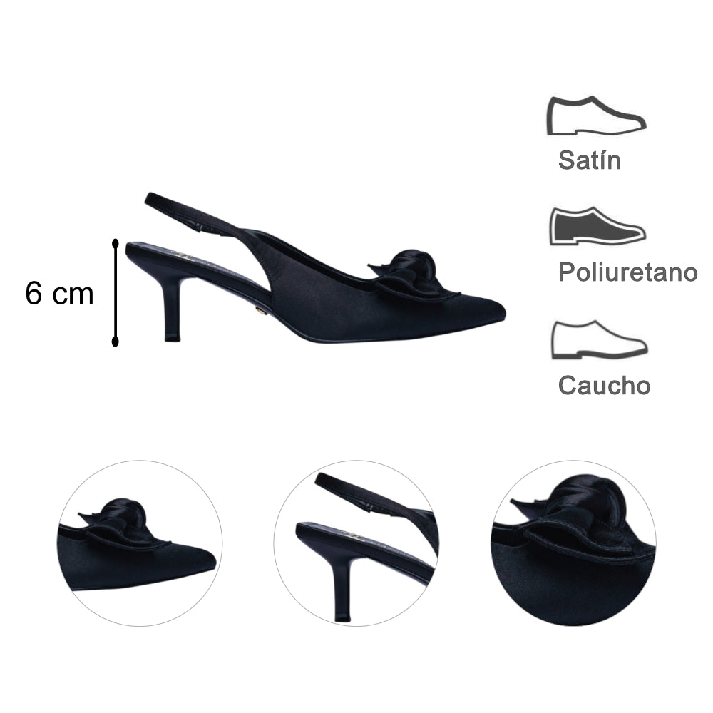 El tacón delgado de 6 cm brinda la altura justa para estilizar la figura, manteniendo a la vez la comodidad para usarla durante todo el día o en eventos prolongados. El corte en satín aporta un acabado premium con un brillo sutil, mientras que la suela de caucho asegura firmeza y estabilidad al caminar.