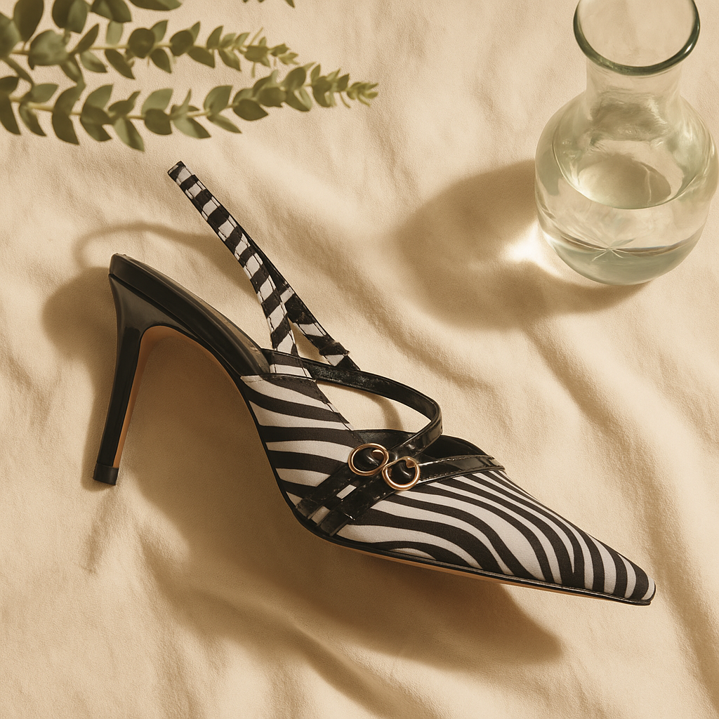 Atrévete a destacar con estas zapatillas tipo pump de tacón alto en estampado cebra, un diseño que fusiona elegancia y audacia en cada detalle. Su silueta estilizada con punta fina y tiras cruzadas realza la feminidad con un aire sofisticado, mientras que el contraste en blanco y negro aporta un toque moderno y versátil que nunca pasa desapercibido.